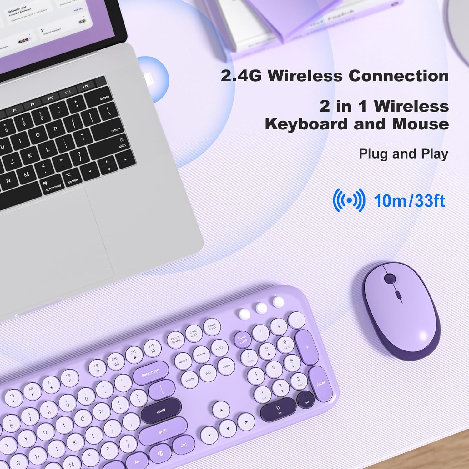 - Wireless Keyboard and Mouse Combo: 104-key colorful keyboard with floating round keys, with foldable stand and anti-slip pad ensures comfortable typing. Optical mice with 3 sensitivity levels provides precise control.