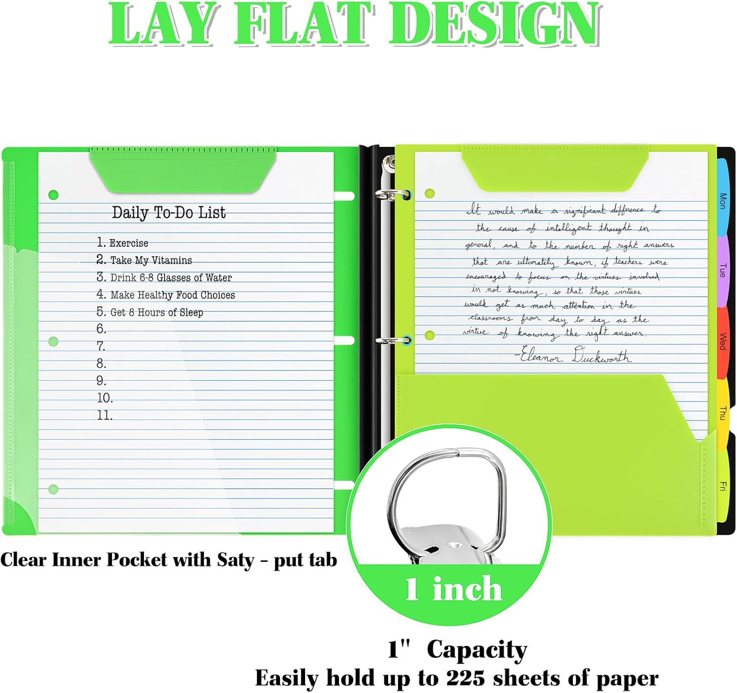 INFUN 1 Inch Telescoping 3 Ring Binder - 1PCS,Flexible Round Binder with Customizable Front Cover and Clear Catalog Pocket, 1 Inch Rings, 225 Sheet Capacity- Green