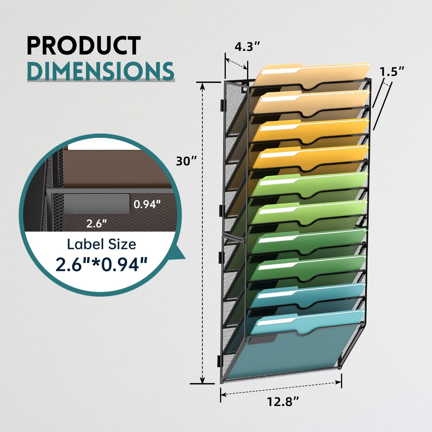 - [10-Tier Wall File Organizer] This wall mounted file organizer features 10 pockets, with small labels, used in file classification and storage of stationery.