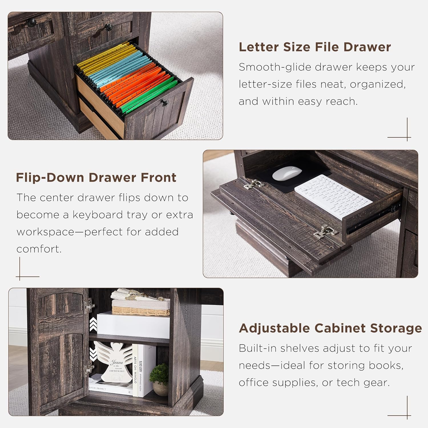 OKD 60" Executive Desk with Drawers, Farmhouse Home Office Desk with Charging Station, Keyboard Tray, File Cabinet Storage, Wood Computer Desk for Work and Study, Dark Rustic Oak