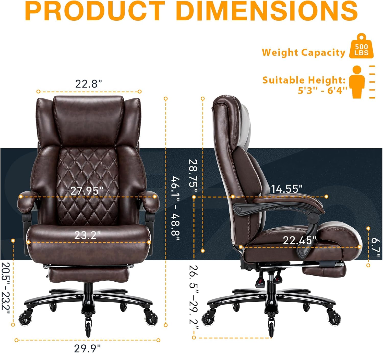 500 LBS Big and Tall Office Chair with Foot Rest High Back Recline Ergonomic Chair for Heavy People, Executive Office Chair Comfortable for Home Office, Large Computer Desk Chair Brown
