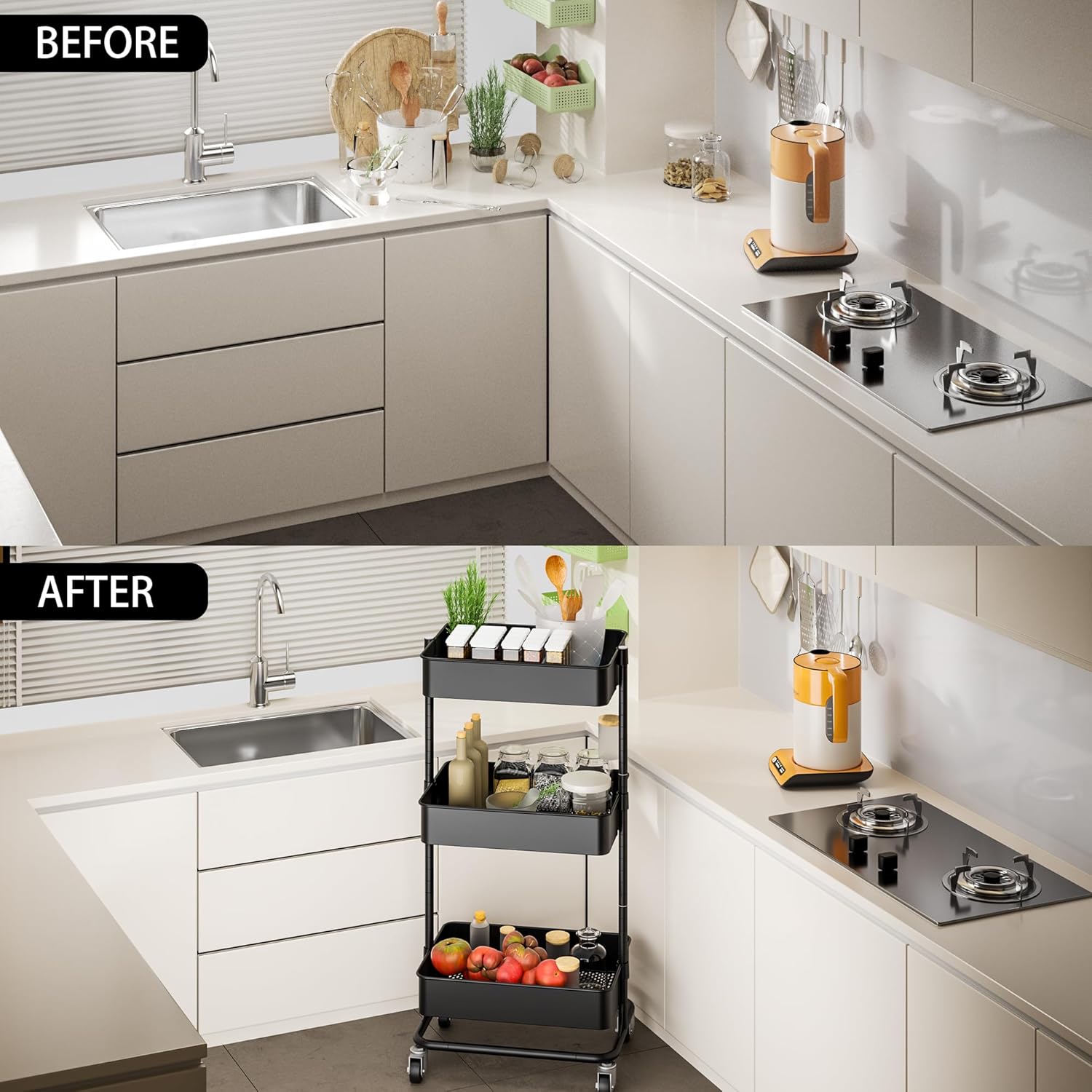 - 【Multifunctional Storage】The metal rolling cart with wheels can be used almost anywhere. It can be a snack cart, nursery cart, tool cart, service cart, book cart, or organization rack in your kitchen, bedroom, living room, office, garage, or workshop.