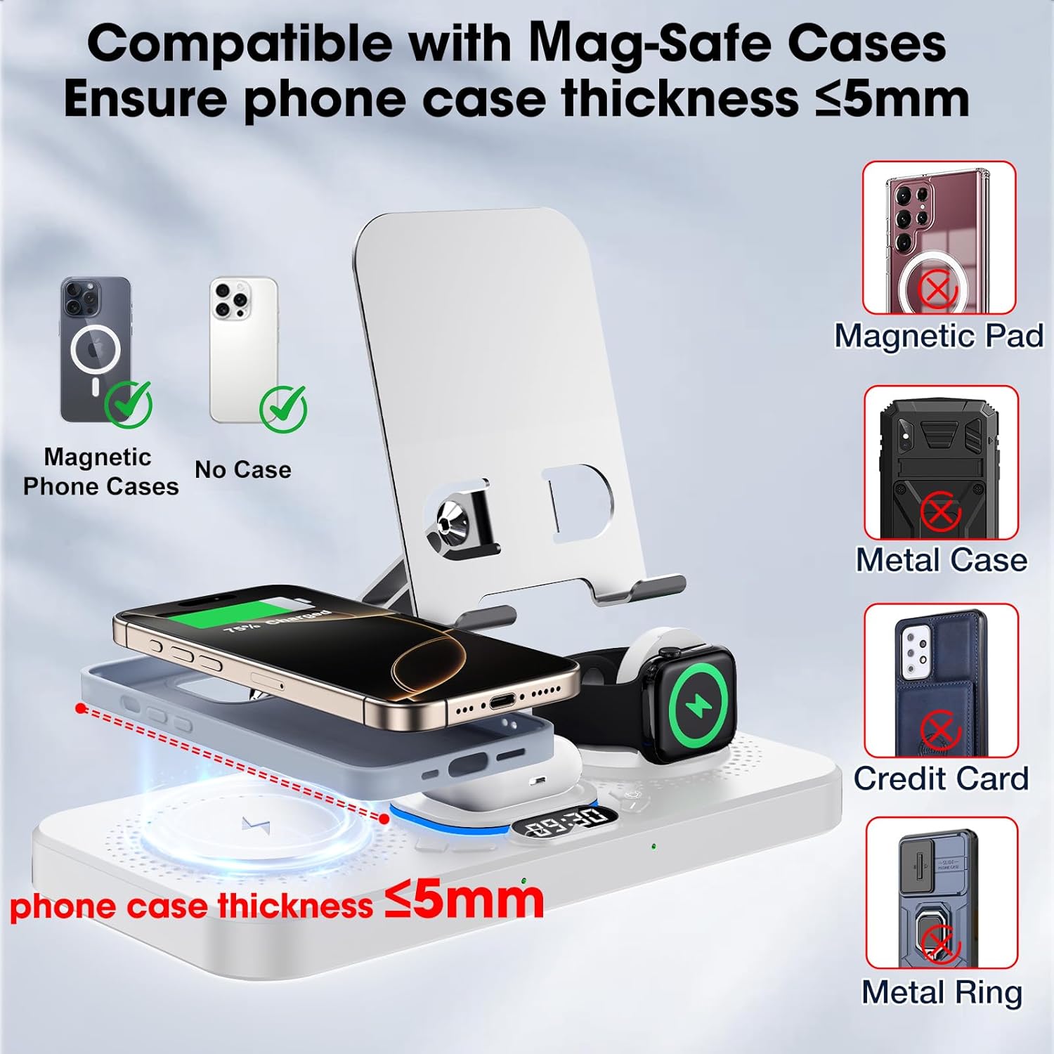 - [Smart Charging with Multiple Protections] Designed with advanced safety features, this charging station includes over-current protection, over-voltage protection, and foreign object detection. It provides comprehensive protection for your electronics. Tip: For optimal performance, remove phone cases thicker than 5mm, magnets, or metal accessories before charging.