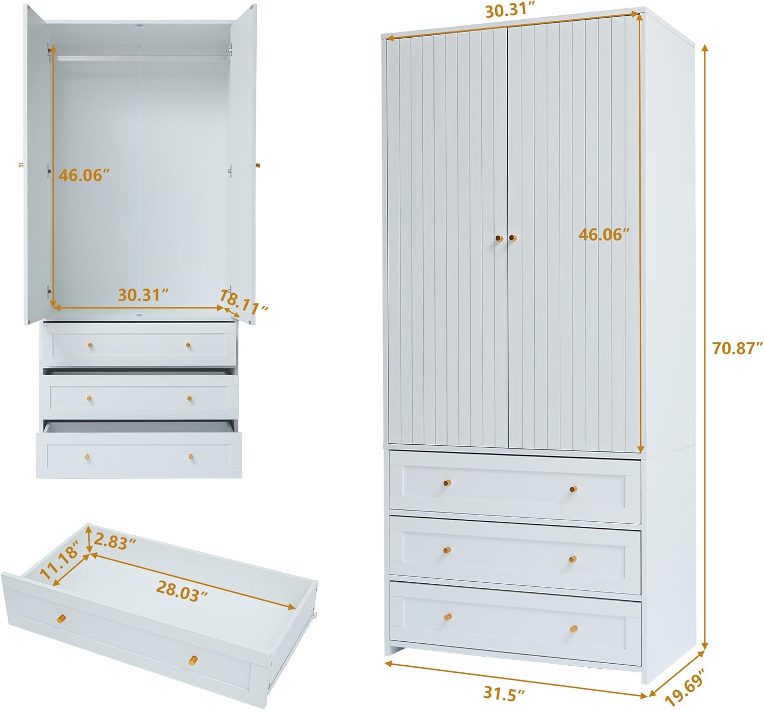 71" Wardrobe Closet Armoire, Wardrobe Armoire Wooden with 2 Doors, 3 Drawers Household Freestanding Wooden Closet Storage Cabinet for Bedroom (White)