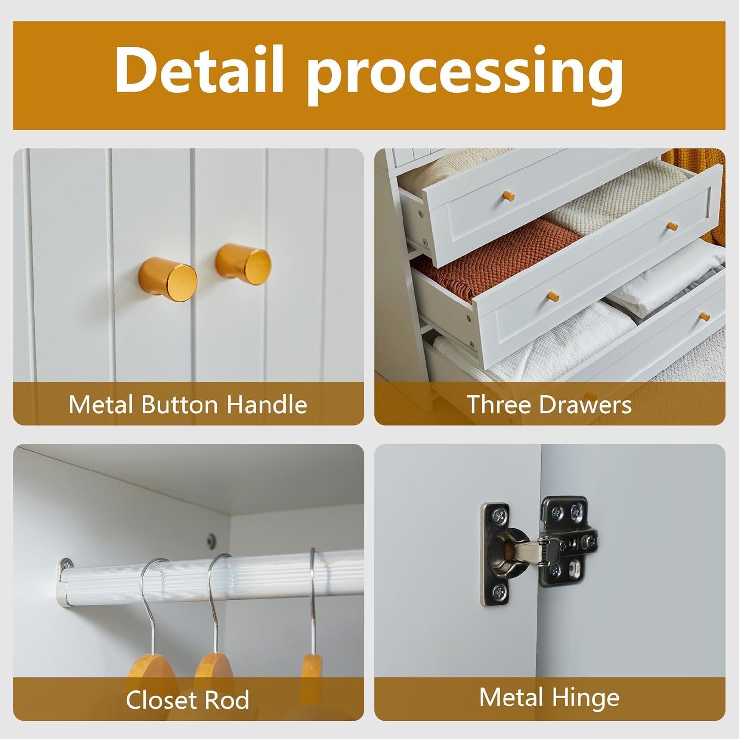 - 【Elegant Style】This wooden wardrobe is simple, it combines white panels with gold handles to create luxury charm.This large wardrobe matches well with various house decors.