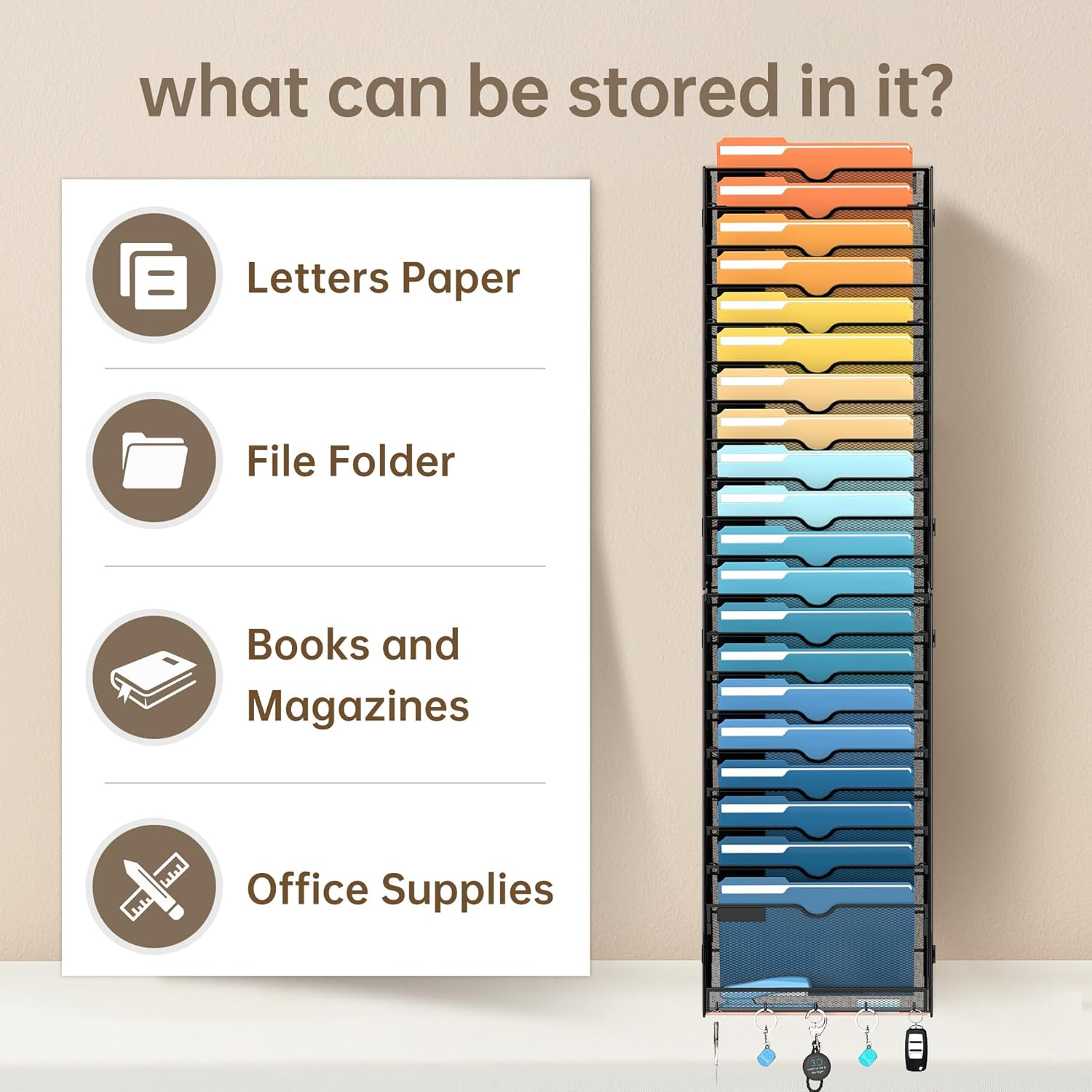 - [20+1 Wall File Organizer] This hanging wall file organizer has 21 vertical pockets wall mounted file organizer with small label to classify your documents, you can store folders, magazines and paper in it. The 1 bottom flat tray is great for stationary, desk accessories.