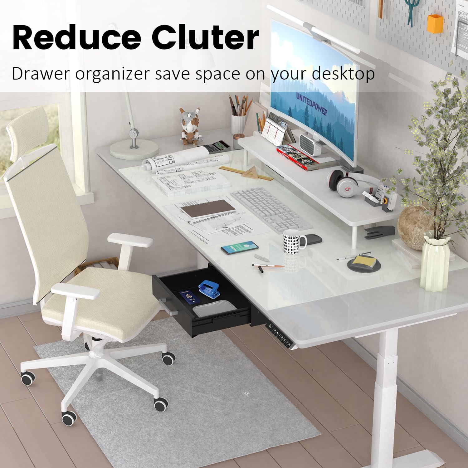 - Save Space: Always have a feeling there is too much stuff on your work desk, having trouble finding what you need in all the mess ? easily add storage space to your standing desk with the sliding under desk pencil drawer. Free your space and organize the way you like