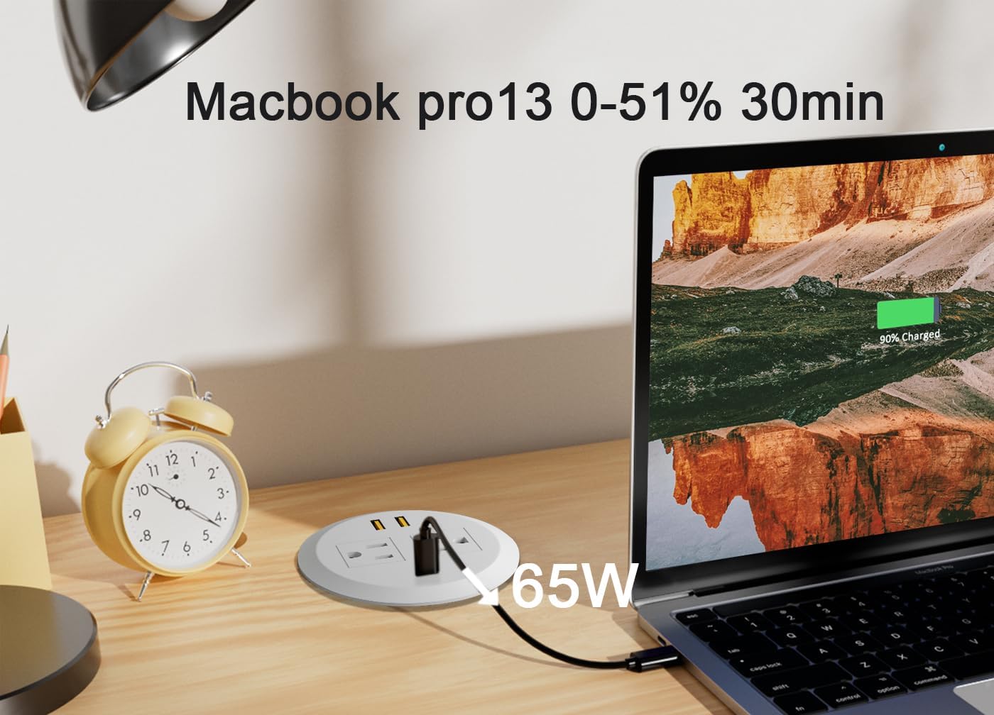 - All-in-One Recessed Power Outlet- 2 AC outlets,1 GaN USB-C port(Max 65W),and 2 USB-A ports(Max 36W) power everything on your desk from a single recessed power grommet,6.26 ft extension cord,45-degree flat plug
