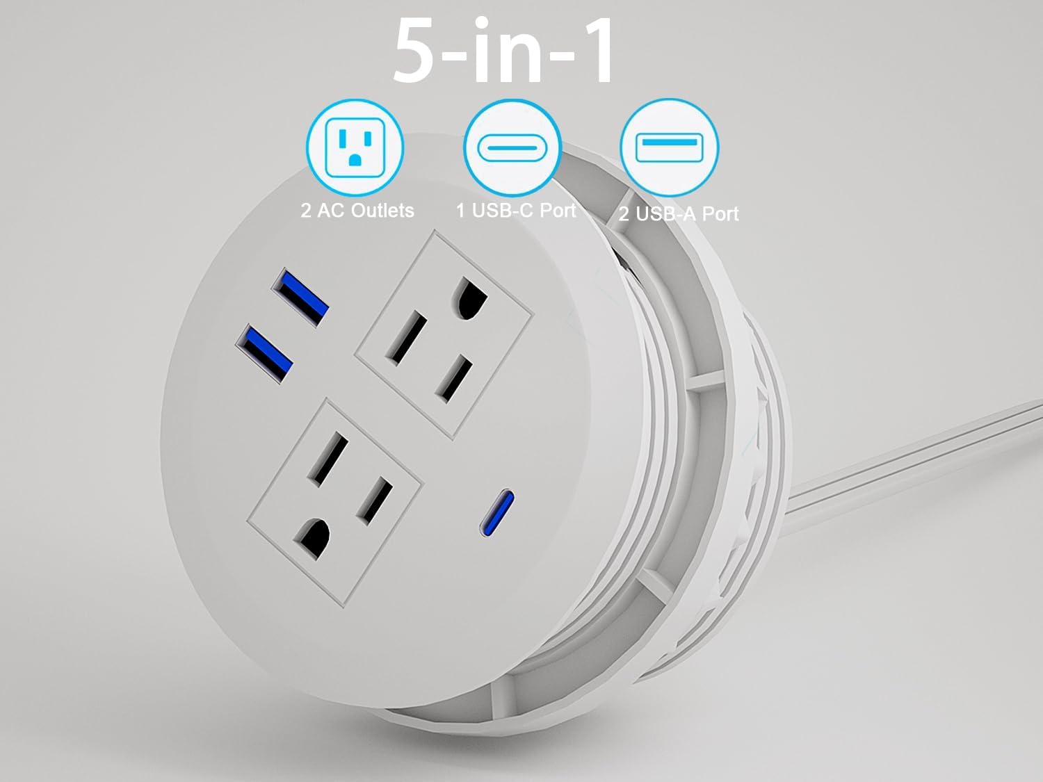 - All-in-One Recessed Power Outlet - 2 AC outlets,2 USB-A ports,and 1 USB-C port power everything on your desk from a single recessed power grommet,10 ft extension cord