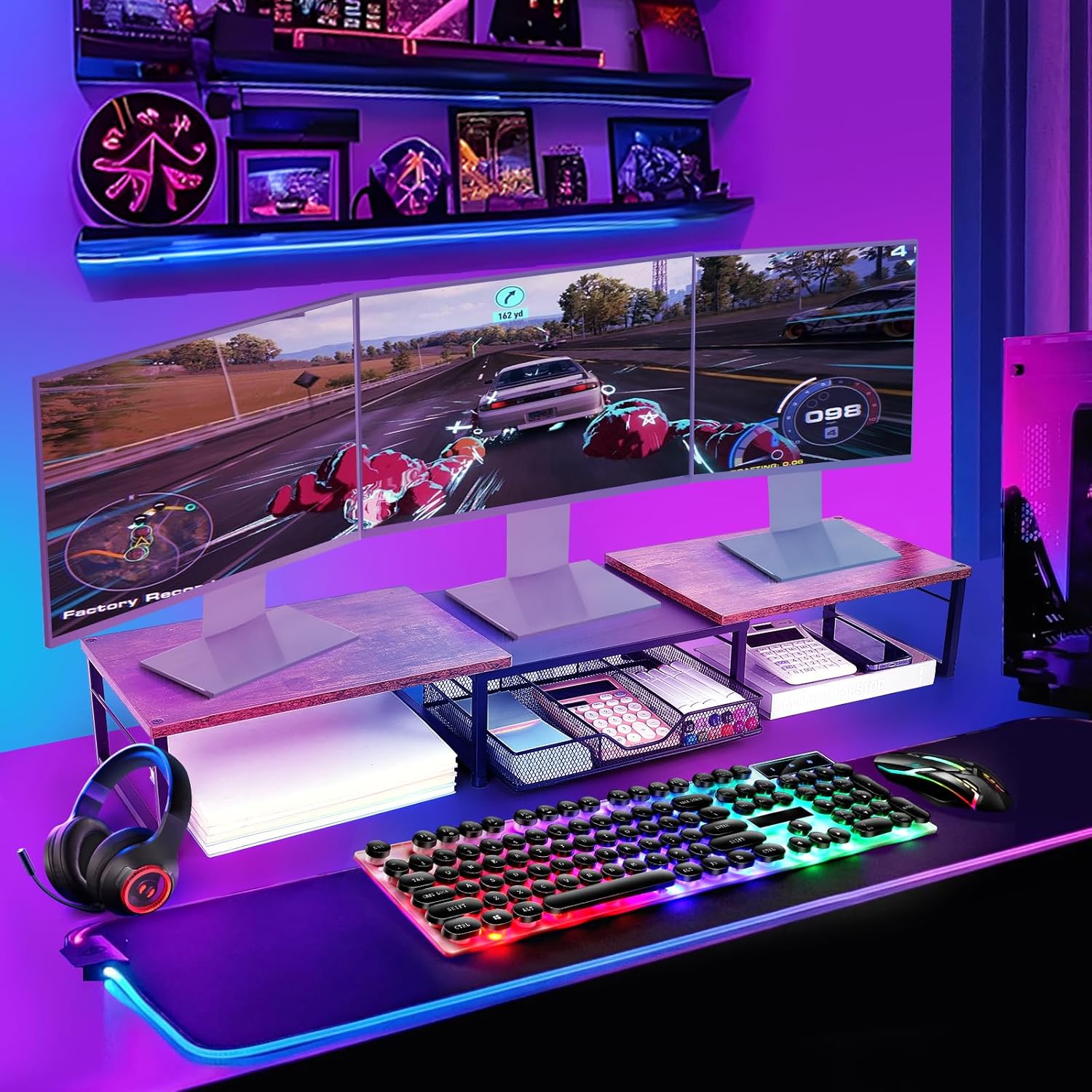 Dual Monitor Stand Riser, Desk Organizer with Drawer, Desk Organizers and Accessories, Workspace Organization Computer Monitor Stand for Laptop, Printer, TV, Office Supplies, Rustic Brown