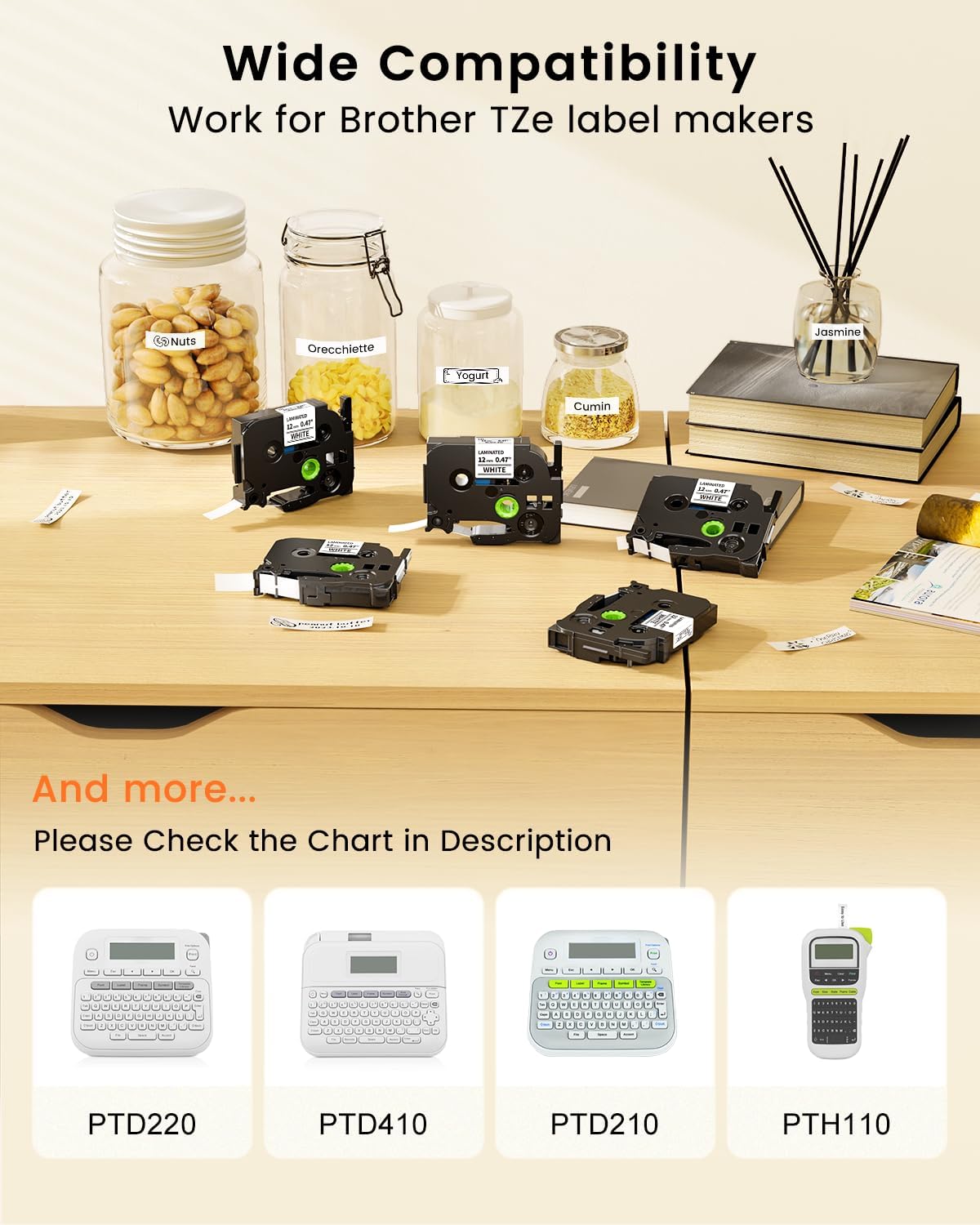 - Strong Adhesion that Lasts – Designed for durability, these replace for p touch label tape resist water/extreme temperature/oil/abrasion/fading and peeling, sticking reliably on various surfaces from kitchen containers to office binders, ensuring your labels last as long as you need them