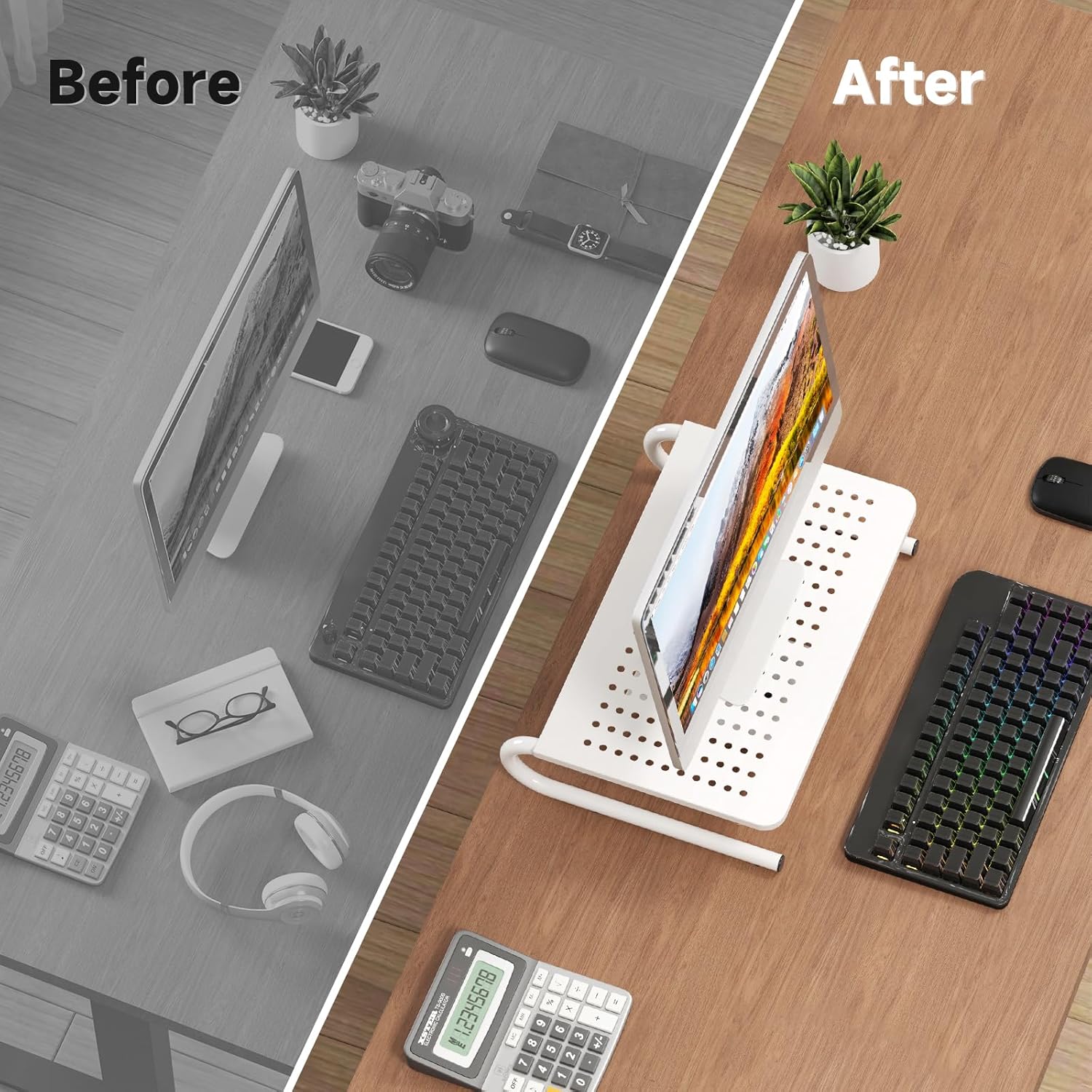 - Organization: sleek modern Black design complements any desk and the extra space underneath the platform for a neat surface