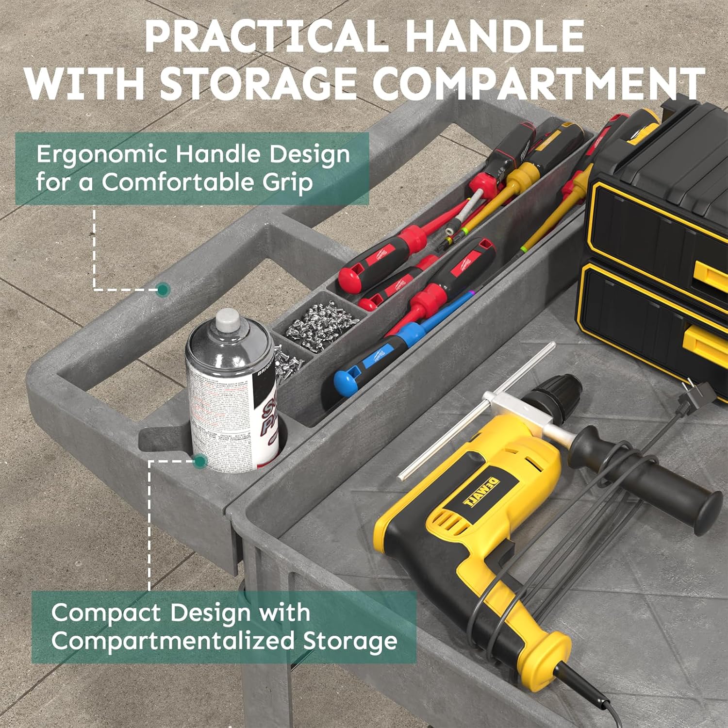 - 【Portable Design】Plastic utility service carts are equipped with ergonomic armrests that allow you to move with less effort and experience a comfortable grip. Modular storage compartments and small holes are designed to keep your tools handy and enhance your experience.