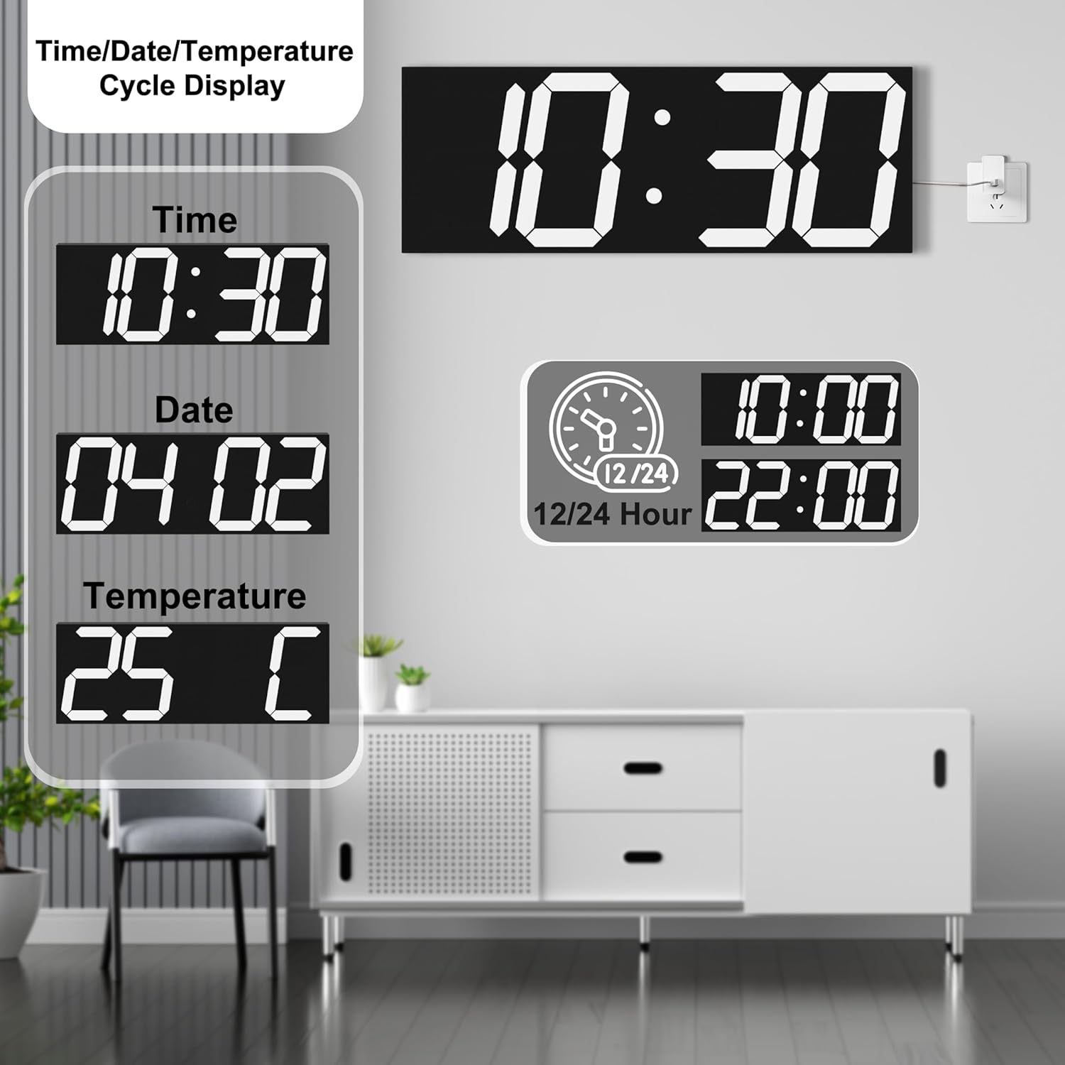 - Clearly Visible Large Digital Wall Clock: The advantage of a large digital wall clock is its clarity. The bright, high-contrast numerals are easy to read from a distance and in all lighting conditions, and the large, eye-catching 6-inch numerals are easy to see for the visually impaired.This clock is especially helpful for seniors or those with vision impairments. Additionally, the clean, straightforward design promotes a modern and minimalistic aesthetic, fitting seamlessly into any space. It combines functionality and style, providing both practicality and ease of use.