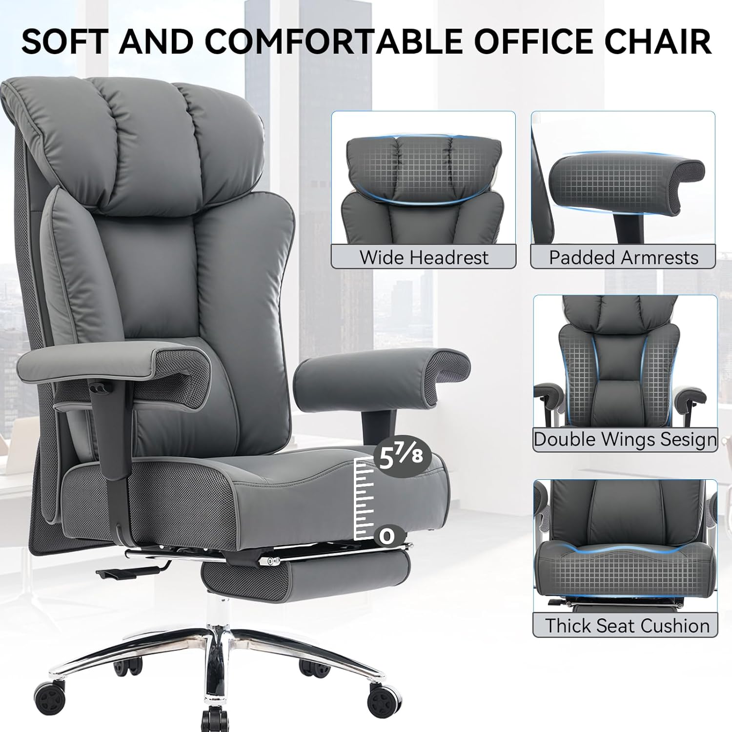 Efomao Big and Tall Office Chair 450LBS with Foot Rest, High Back PU Leather Executive Chair with Adjustable Padded Armrests, Lumbar Support for Home or Work, Heavy Duty Computer Chair, Grey