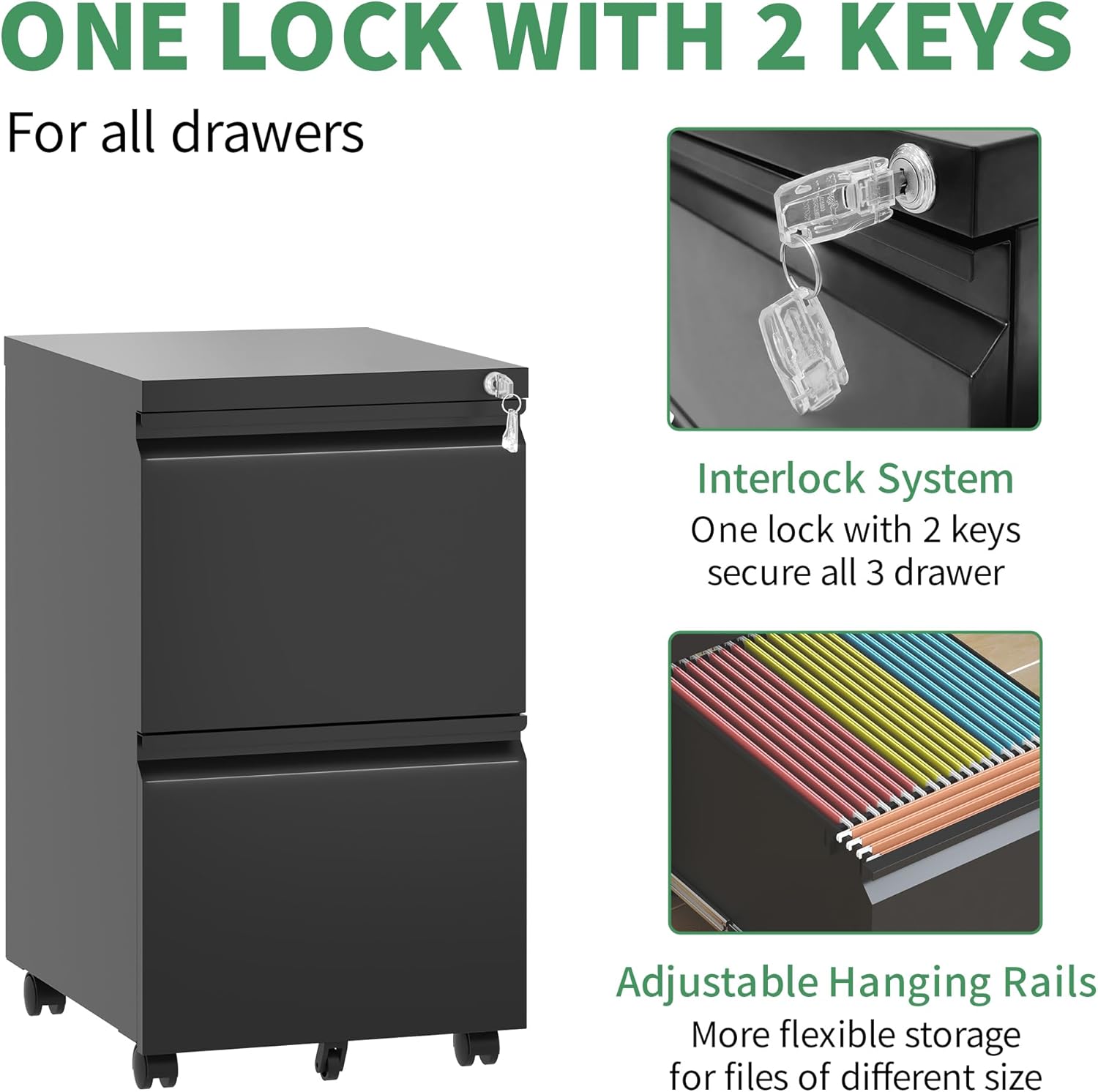 - 【Privacy Security】The 2 drawer file cabinet with wheels is equipped with 2 Keys, 1 lock secures all three drawers. It is the best choice for office and personal use, keeping your personal belongings and documents safe when you leave the office or home.