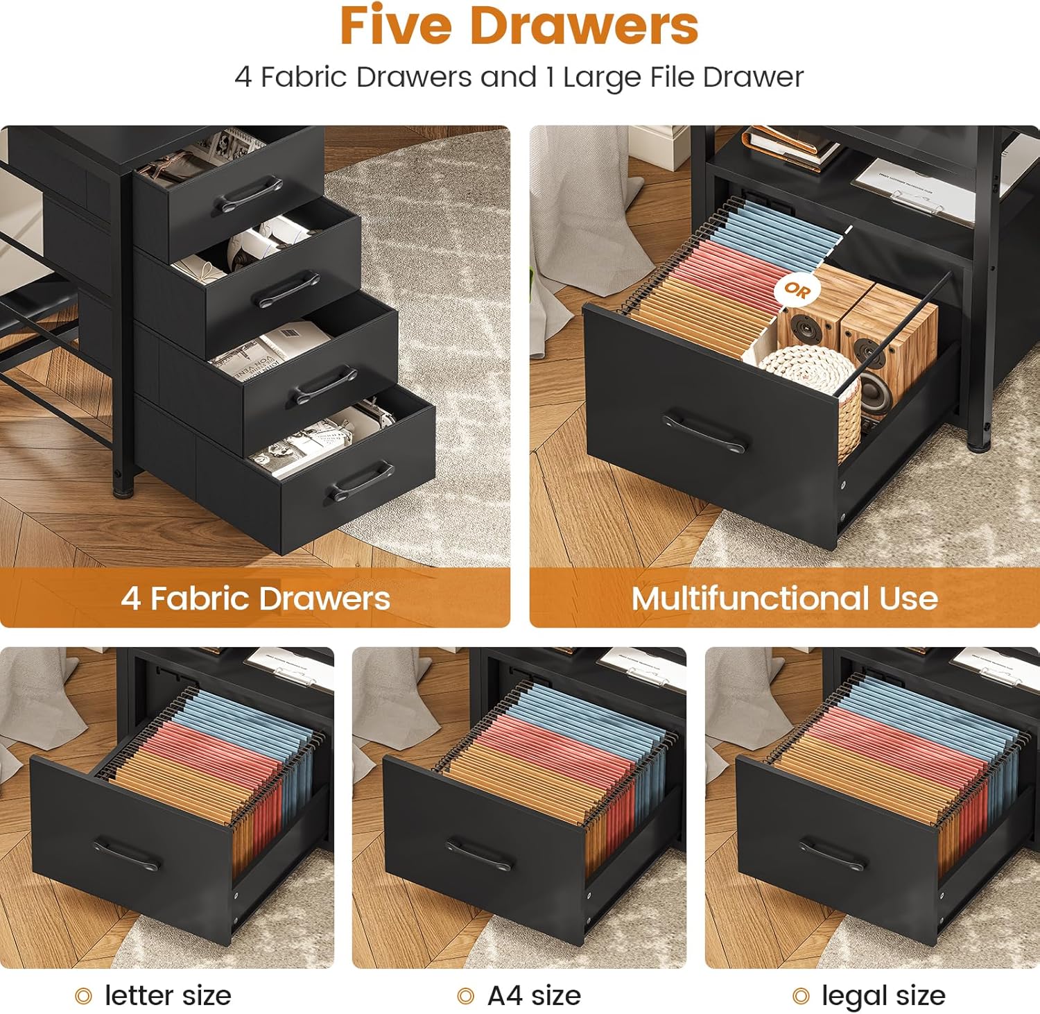 - ă5 Large Storage DrawersăComing with a file drawer, fabric storage drawers, printer cabinet and open shelves with powerful storage space. File cabinet can hold letter/A4/legal files. This solid constructed computer desk could hold printers, scanners, fax machines and any other office machines, keeps printer or scanner within easy reach of your desk to free up work space.