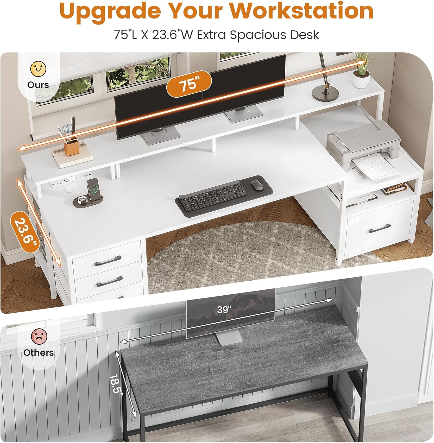 SEDETA White Computer Desk with 5 Drawer & Power Outlet, 75'' Home Office Desk with File Drawer, Storage Shelves, Printer Cabinet and Monitor Shelf, Gaming Desk with Led Lights, 23.6" W Desktop