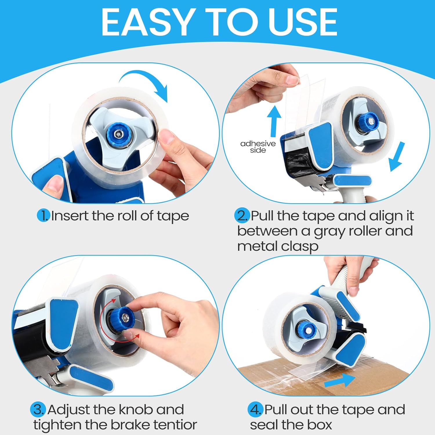 - Easy to Use: our packaging tape with dispenser is safe and simple to use; Place the tape on the roller, tear the tape, and thread one end through the metal sheet; Is ready to use; After it makes sealing multiple package easily without losing many time