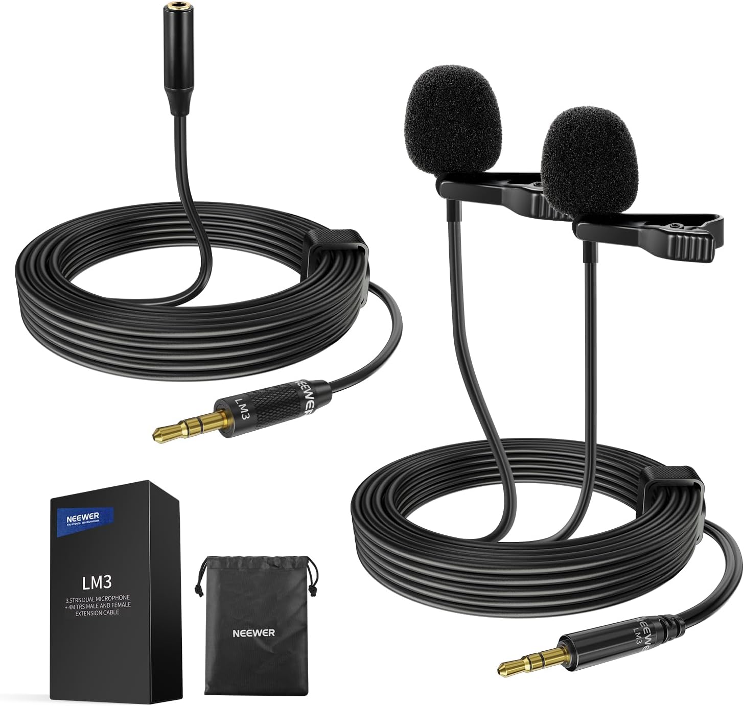 NEEWER 2m Wired Dual Lavalier Microphones with 4m Extension Cable, Mini Clip On Omnidirectional Condenser Lapel Lav Mic 3.5mm TRS for DSLR Mirrorless Camera Camcorder Interview Vlog, LM3