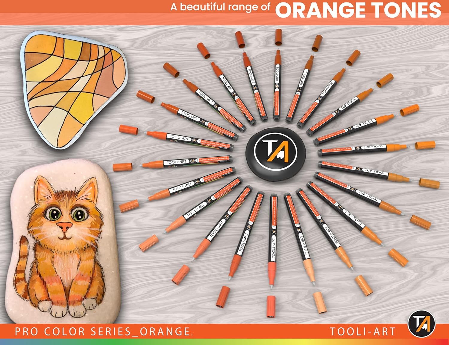 Acrylic Paint Pens 22 Orange Tones Assorted Pro Color Series Markers Set 0.7mm Extra Fine Tip for Rock Painting, Glass, Mugs, Wood, Metal, Canvas, Projects, Non Toxic, Waterbased, Quick Drying