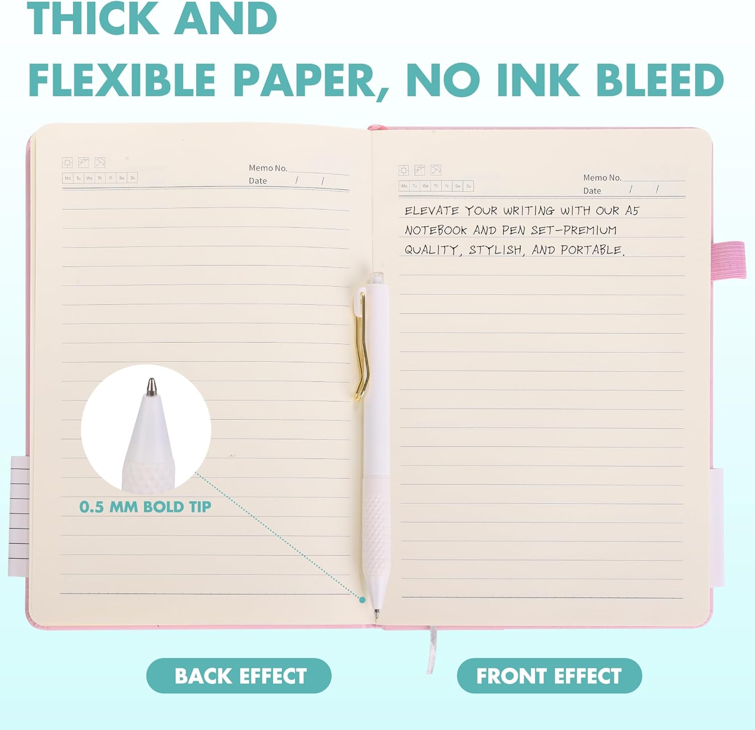 - Quality leather & paper: our A5 notebooks are made of 100 gsm thick paper, providing a smooth touch and resisting ghosting and bleeding, compatible with most pens, pencils and markers; the lined journal notebook with pens feature premium PU leather hardcover, waterproof and easy to clean, helping the notebooks stay upright without the pages curling or bending; the ballpoint pen is designed with a 0.5 mm bold tip for smooth, non-leaking drawing, ideal for use with the journal