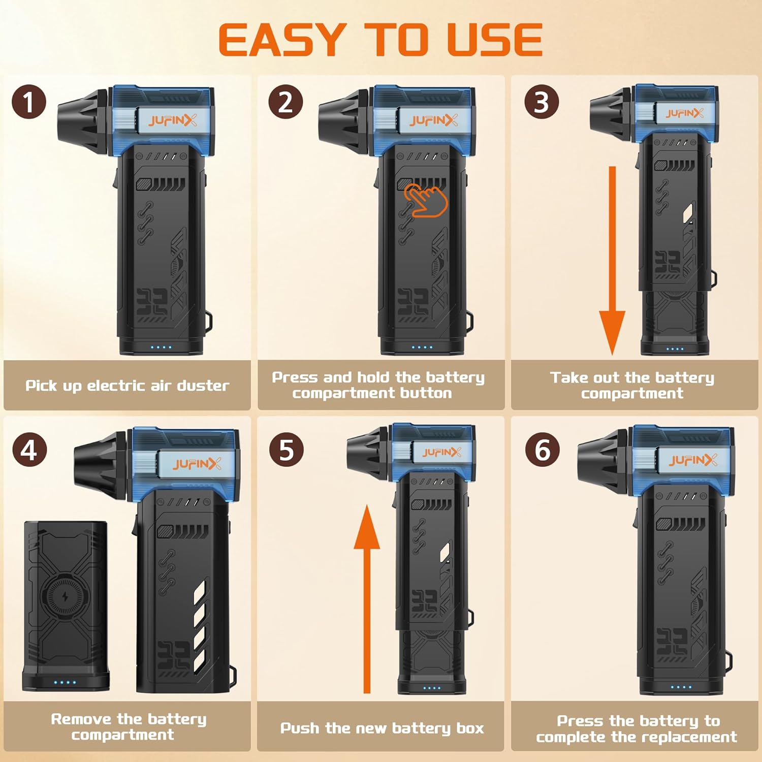 - JUFINX Air Duster -250000RPM Electeic Air Duster, Replaceable Batteries 2pcs,Long Life Cordless mini Blower, 3-Gear Adjustable- Cordless air duster for Keyboard,PCs,Outdoors,Leaves,Car Cleaning