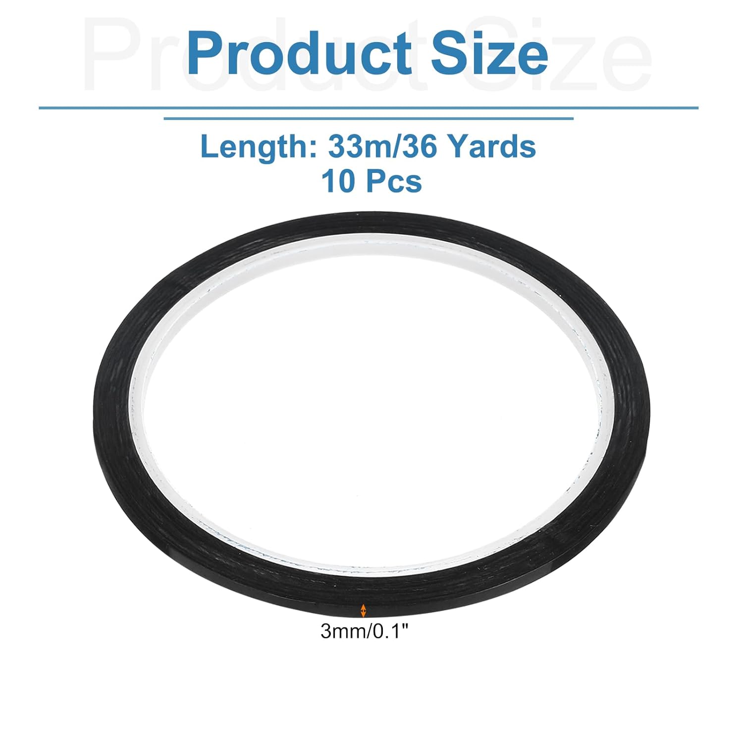- Color:Black;Width: 3mm/0.1 Inch;Length: 33m/36 Yards;Thickness: about 0.06mm/0.002inch;Long-term temperature resistance: about 180Β°C / 356Β°F;Short-term temperature resistance:about 230Β°C / 446Β°F;Type: One-side self-adhesive design;Material: PET;Package Content:10 Rolls x Whiteboard Tape;