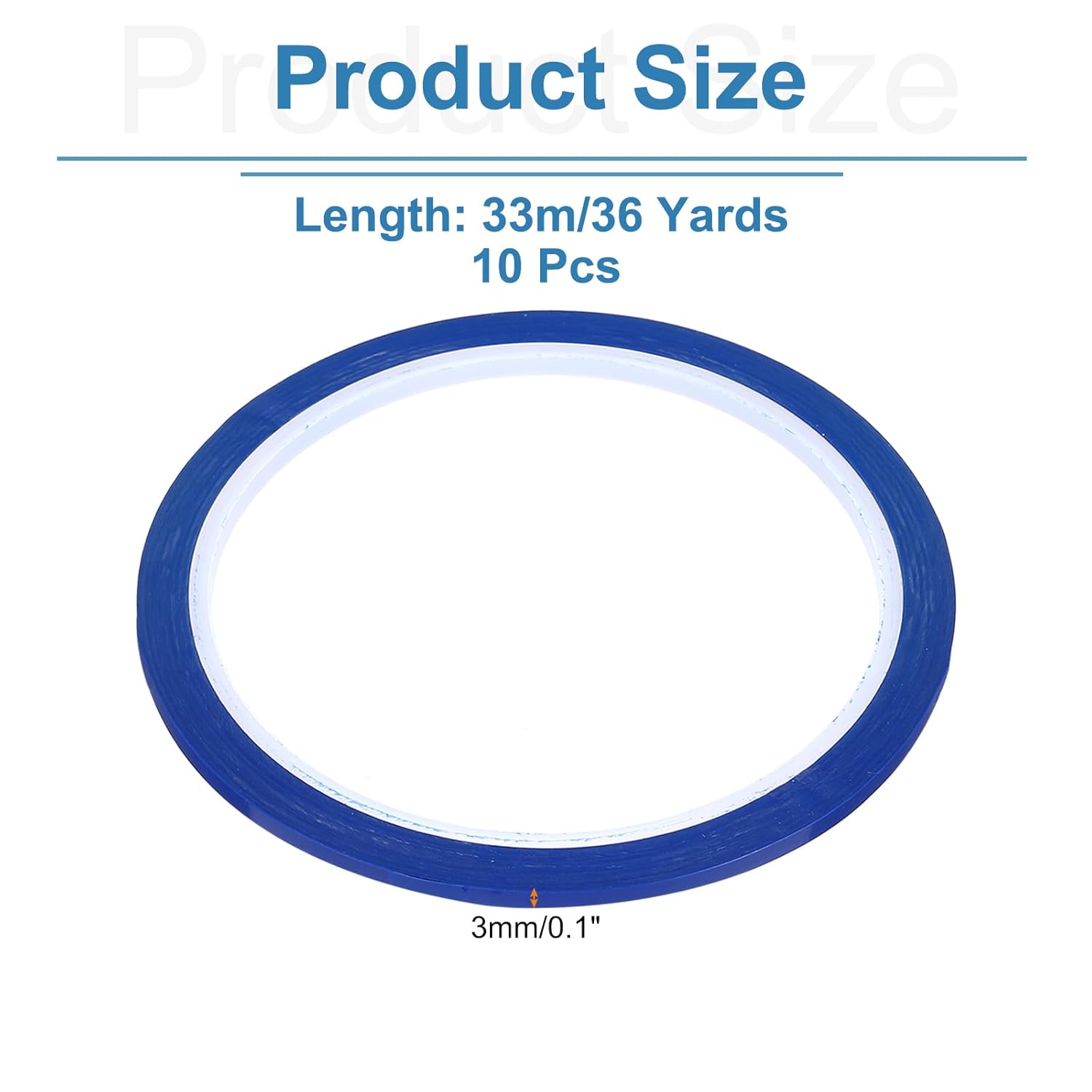 - Color:Blue;Width: 3mm/0.1 Inch;Length: 33m/36 Yards;Thickness: about 0.06mm/0.002inch;Heat resistance: about 120Β°C/ 248Β°F;Type: One-side self-adhesive design;Material: PET;Package Content:10 Rolls x Whiteboard Tape;