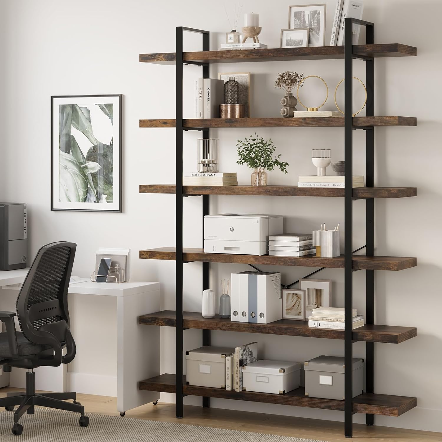 - Versatile Industrial Design: Expertly crafted with high-quality metal and rich brown wood shelves, this six-tier bookshelf seamlessly blends sturdy construction with an industrial charm that complements various decor styles, from modern to rustic