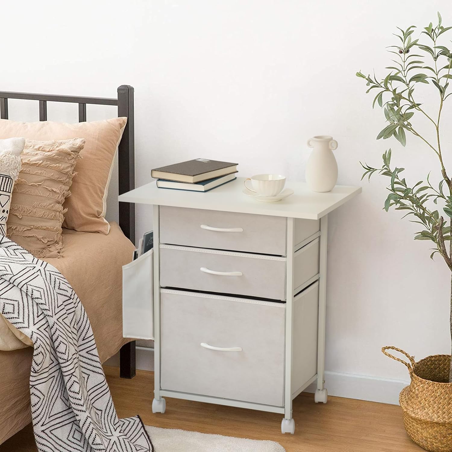 - 【Maximizes Storage Space】This filing cabinet with 3 fabric storage drawers is designed to keep the office machines, paper, and files organized. The side bag holds A4 paper and stationery for quick access. Perfect for your office or home workspace.