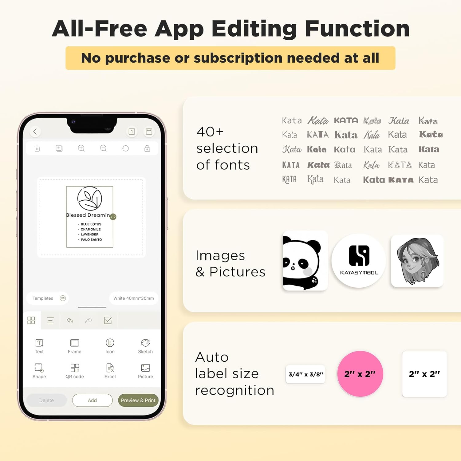 - Versatile App Editing Function: Easily add images from your phone or tablet; customize your labels with 40 fonts, 30 frames, and 450+ icons; all free to use