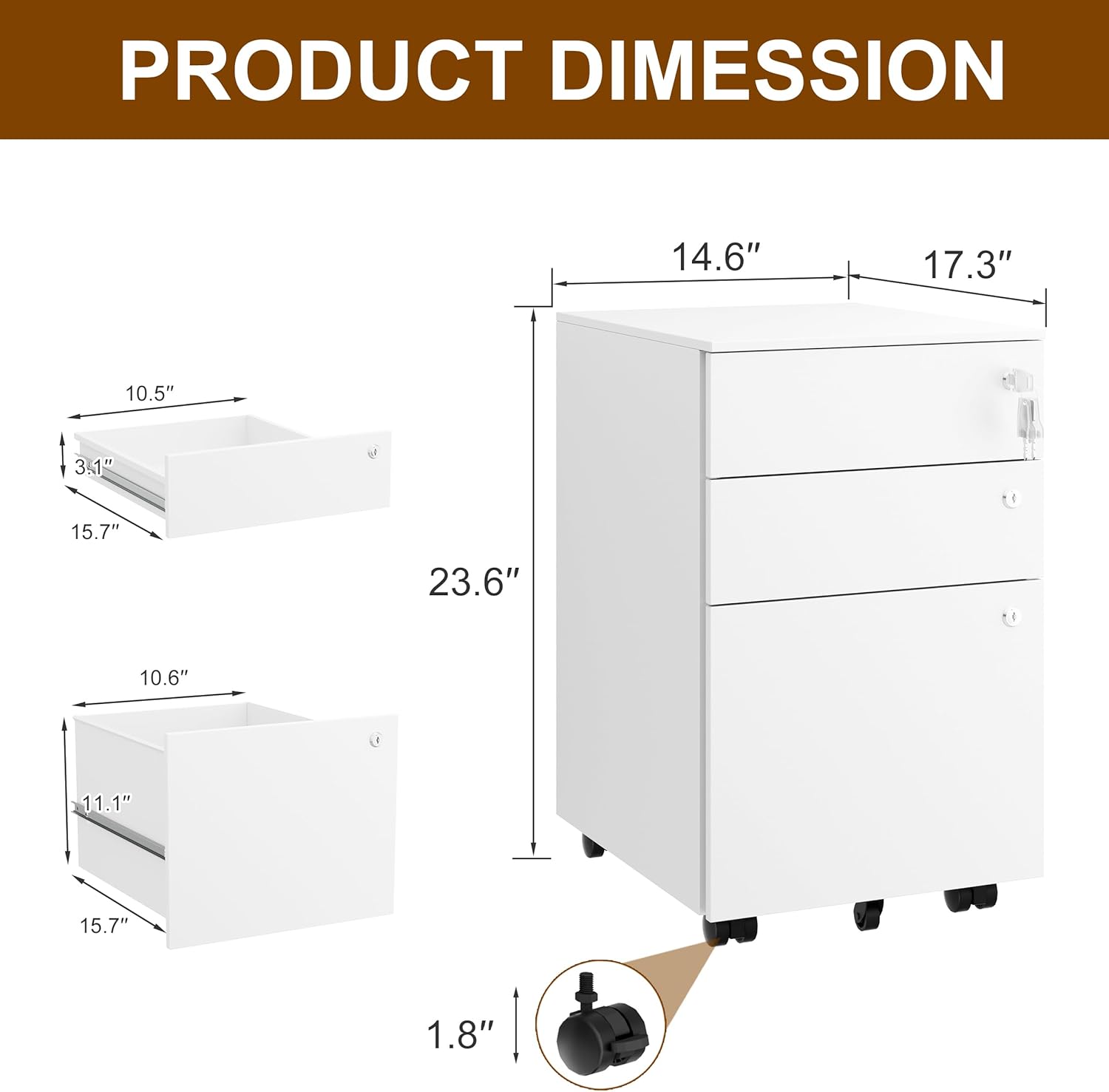 - Special Feature : 360° Wheels, Equipped with lock and 4 keys, Full Extension Slide Design, Fully Assembled