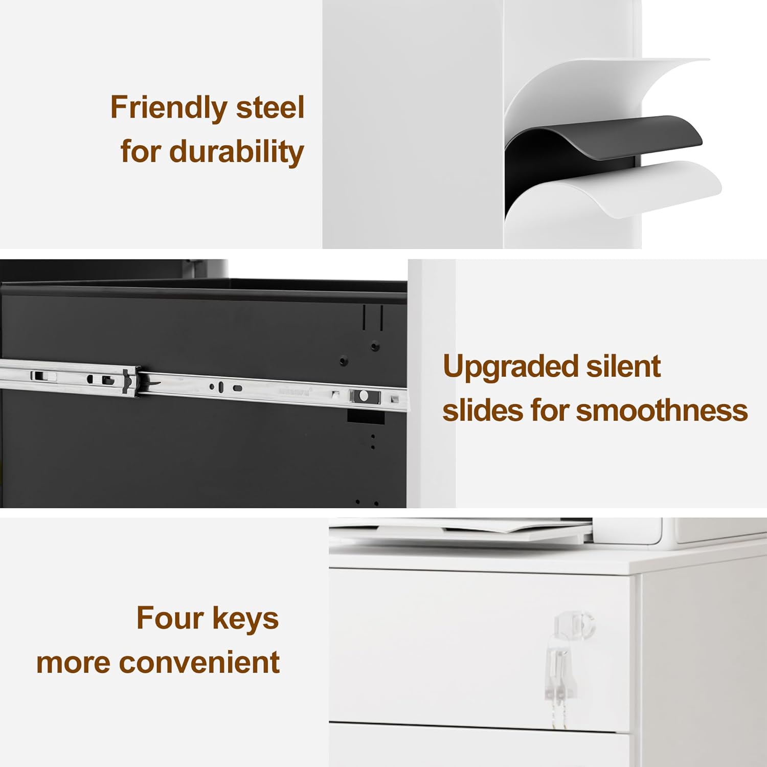 - [Excellent Security and Stability]: Specially designed anti-tip wheels under the large drawers ensure that the filing cabinet remains stable and Even if the drawer is full of files, it will not fall over. The interlocking system and four keys further enhance security and protect your important documents, making it an ideal choice for home offices.