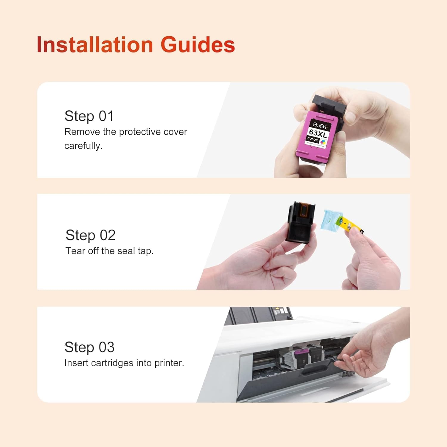 - ăCompatible For HP 63XL Ink Cartridge Combo Packă: You will get ejet for HP ink 63 63XL with upgraded chip replacement for HP63XLblack and color combo pack, total 3 Pack (2 Ă 63XL Black ink cartridge, 1 Ă 63XL color ink cartridges, 1 Ă User guide )