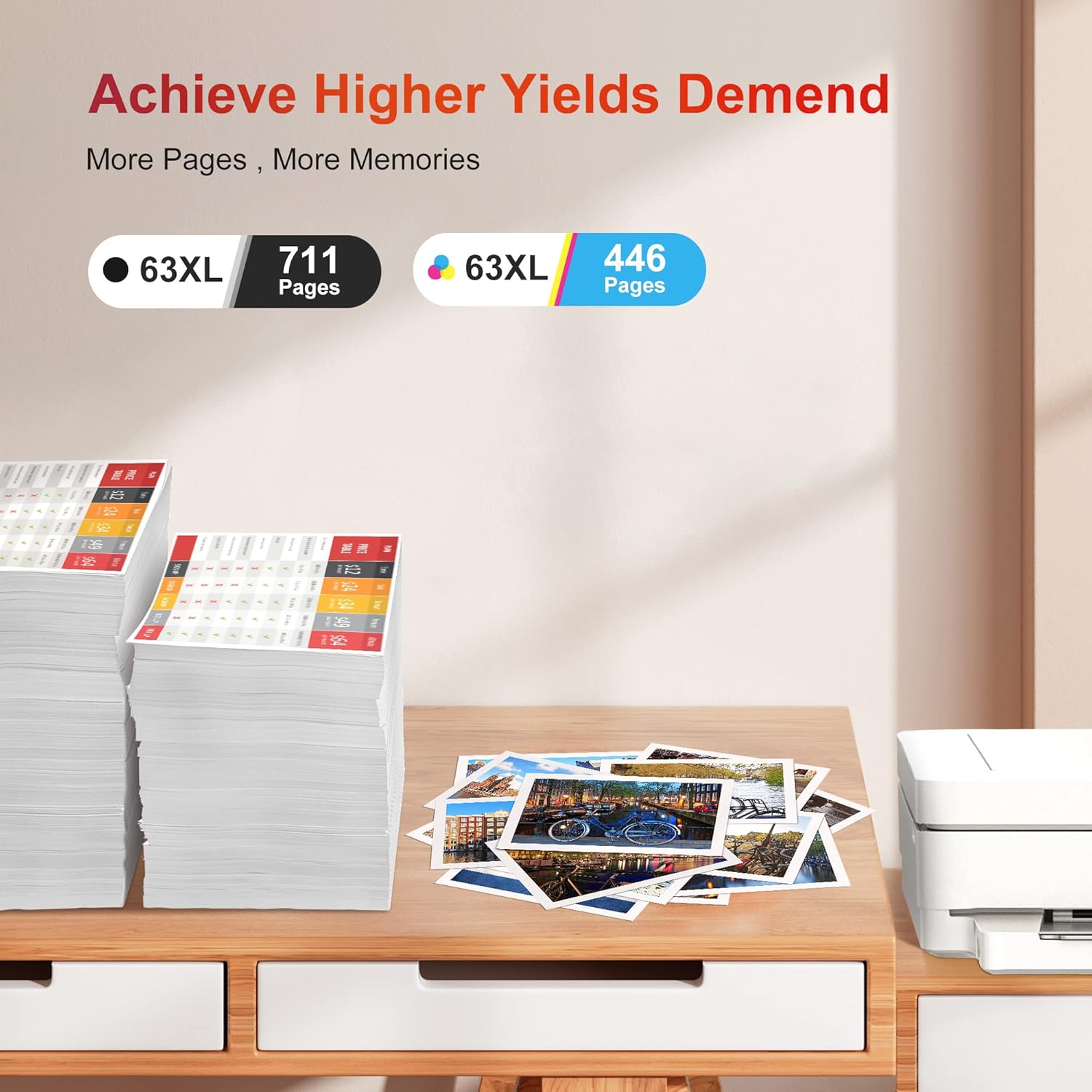 - ăHigh Page YieldăUp to 711 pages per 63 XL black ink cartridge & 446 pages per 63 XL color ink cartridge (At 5% coverage, A4 paper)