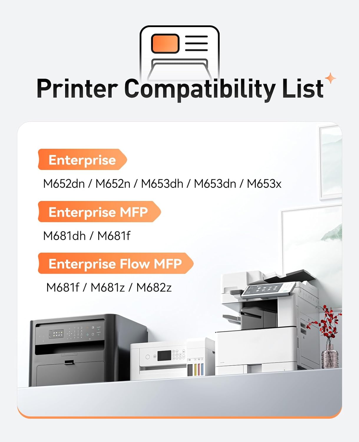 - Compatible Printer: Compatible for HP Color LaserJet Enterprise Flow MFP M681f, M681z, M682z; HP Color LaserJet Enterprise M652dn, M652n, M653dh, M653dn, M653x; HP Color LaserJet Enterprise MFP M681dh, M681f Series Printer.