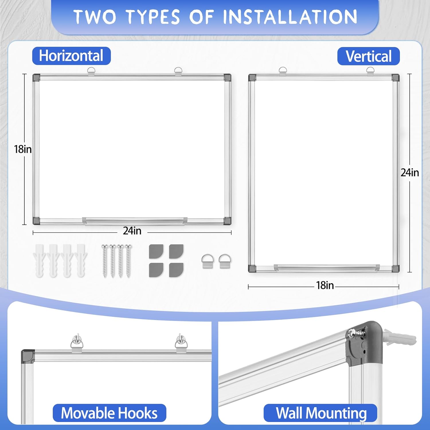 - 🧲Flexible Installation: Flexible installation options allow you to easily hang it using the included removable hook or nail it to the wall using the included mounting accessories for vertical or horizontal installation. Easily customize the white board's orientation to suit your space and needs