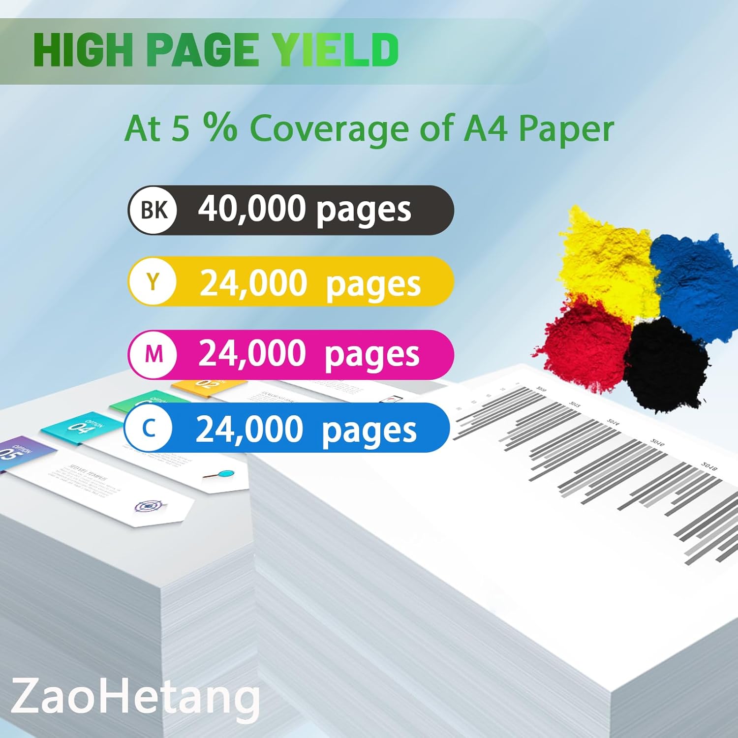 - Page yield: 40,000β¬ pages per black, and 24,000 pages per color toner cartrdges 5% coverage