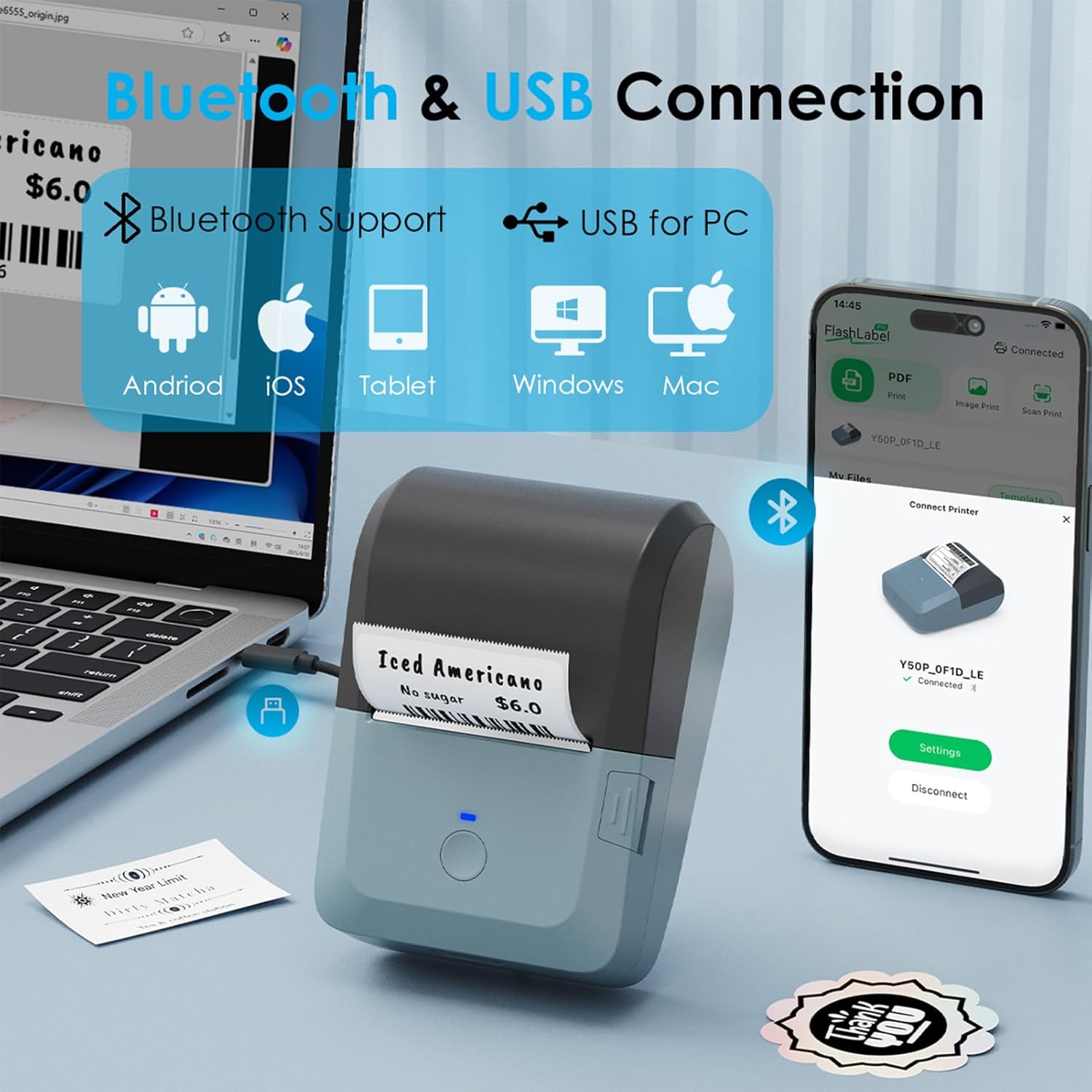 - Bluetooth Wireless Connection: KNAON Portable thermal label printer featuring Bluetooth technology, allowing seamless for with smartphones, tablets, and laptops for printing wirelessly with ease. For iOS and Android users, need to download the 'FlashLabel Pro' App from Apple Store or Google Play. Note: All devices CANNOT be connected directly to Bluetooth, and must be used through the 'FlashLabel Pro' app.
