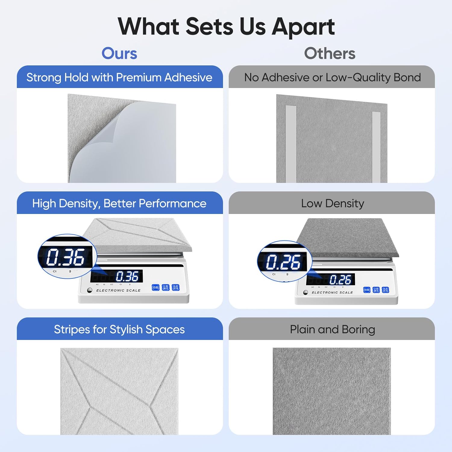 - Exceptional Sound Absorption -- Made with high-density polyester fiber (420 lb/m³), our panels achieve a sound absorption coefficient up to 0.95, effectively reducing echo and ambient noise.