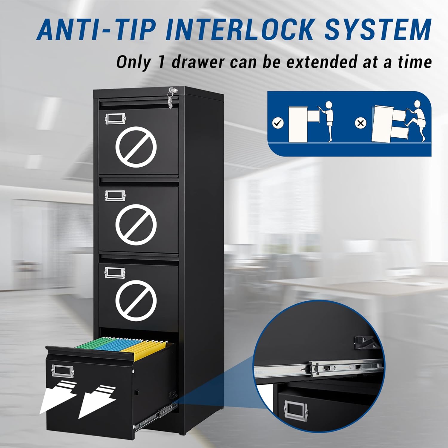 - LOCKABLE 4 DRAWERS FILE CABINET - All the file drawers can be locked by one lock, It is very convenient to control the whole filing cabinet with one key.