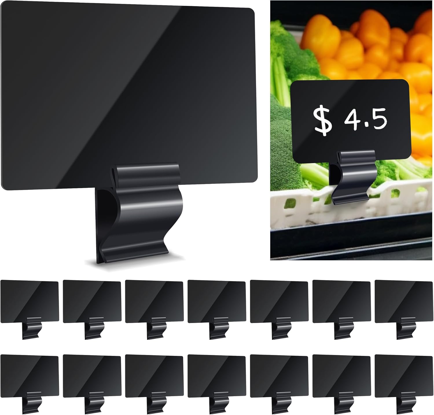 - Easy to Use: The plastic label holder just needs to clip it on the edge of the food tray or bowl, you can write on the label board with liquid chalk, no need for extra stickers and labels. Please tear off all protective films before using the label board for a brighter appearance.Please Note, liquid chalk is not included