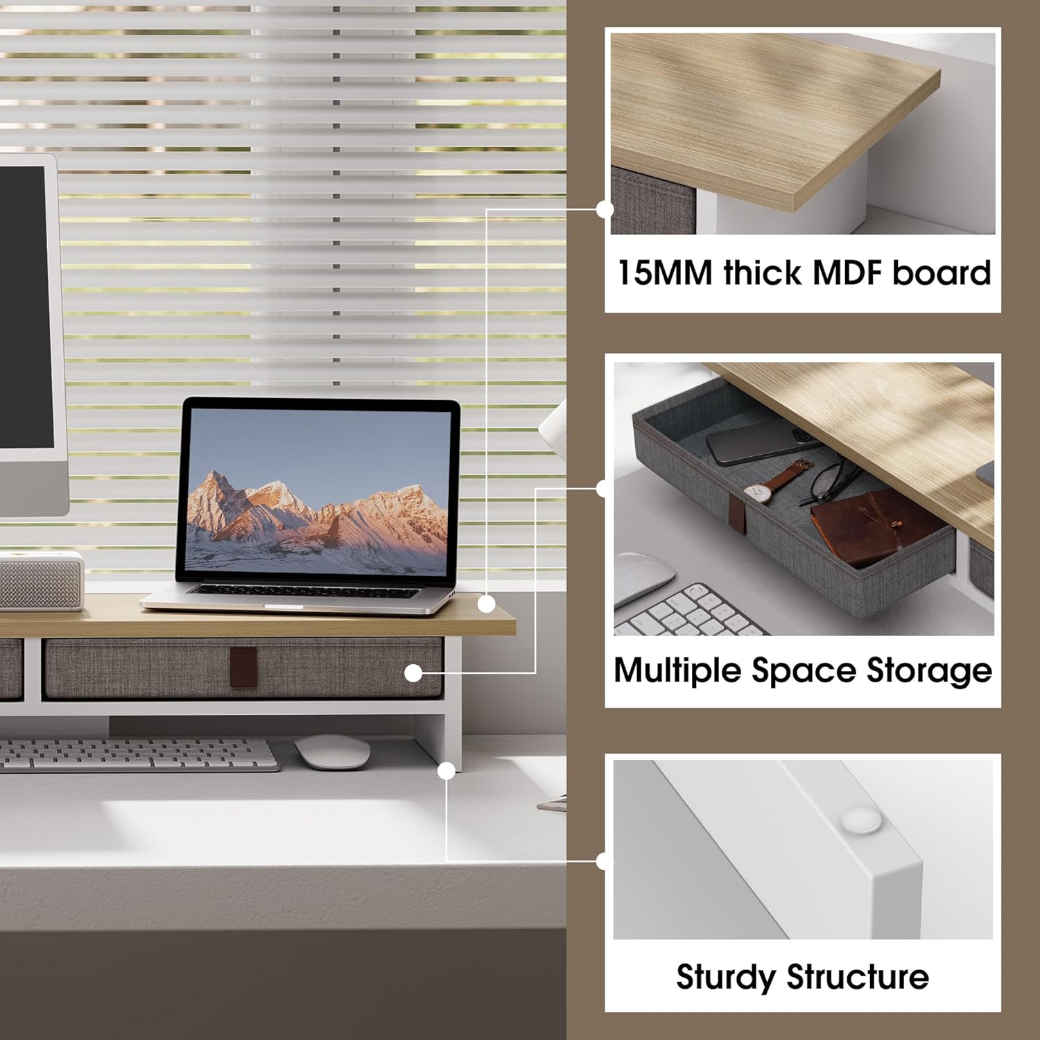 - 【Extra Large Workstation】Equipped with 2 fabric drawers, this monitor stand effortlessly organizes cables, stationery, or office supplies, maximizing desk space while protecting privacy. The 2-tiers structure (35"x9.3") securely holds dual monitors, printers, or TVs, transforming cluttered desks into streamlined workstations.