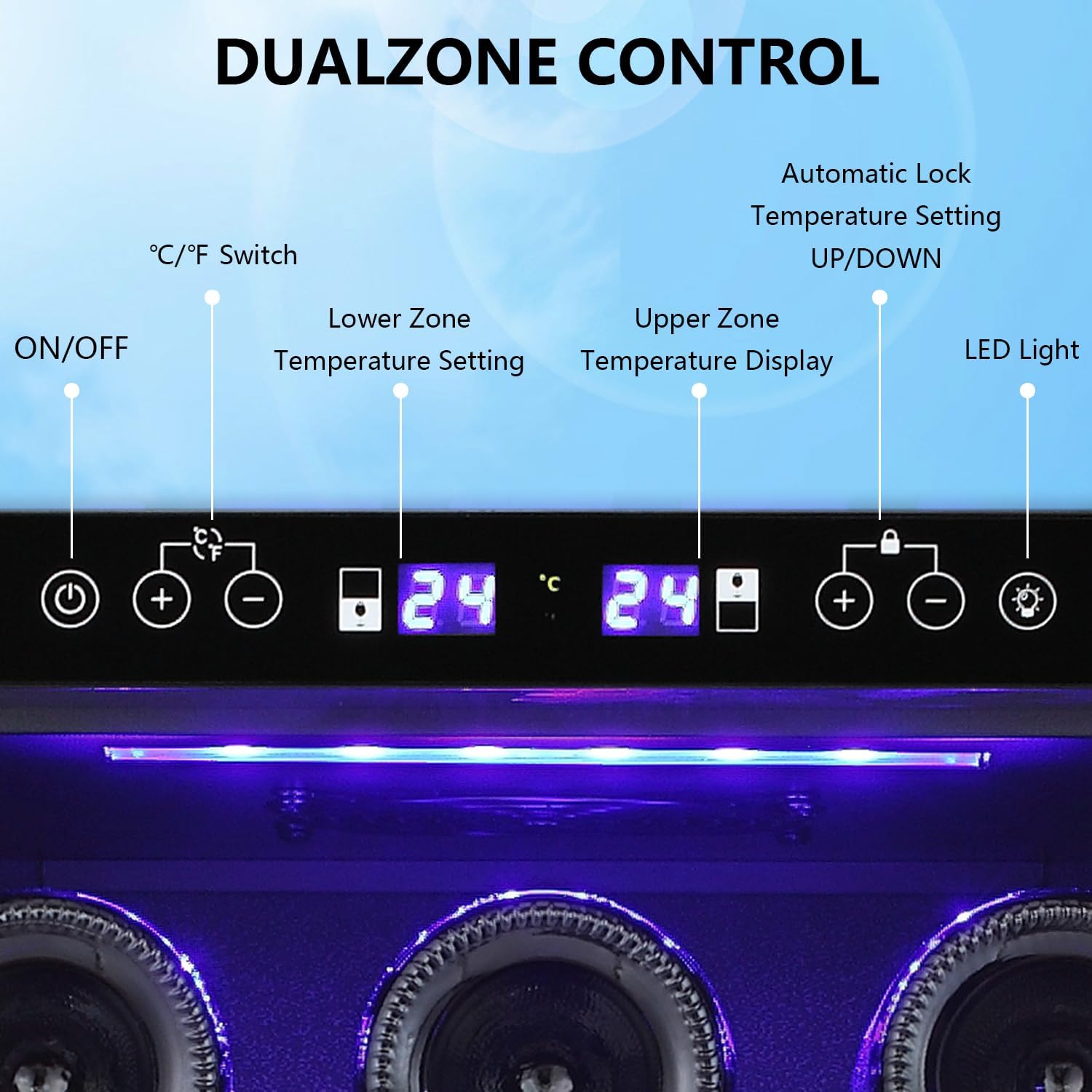 - QUIET & LOW VIBRATION:Advanced cooling system, low vibration effect and noise, allowing your wine to age and settle properly, with no disturbance to its natural occurring sediments. You could change the upper zone temperature from 41-54℉ and the lower zone temperature from 54-68℉, a suitable temperature will give the wine a better taste.