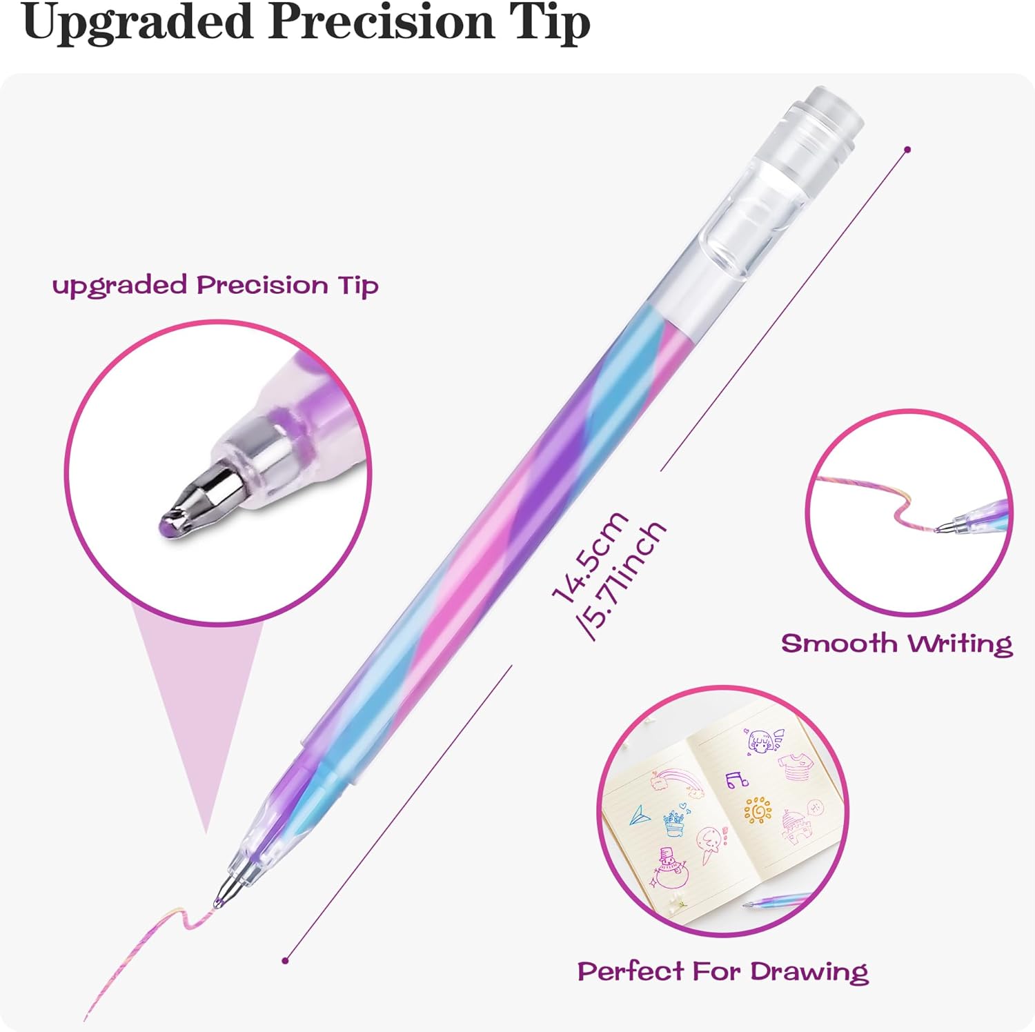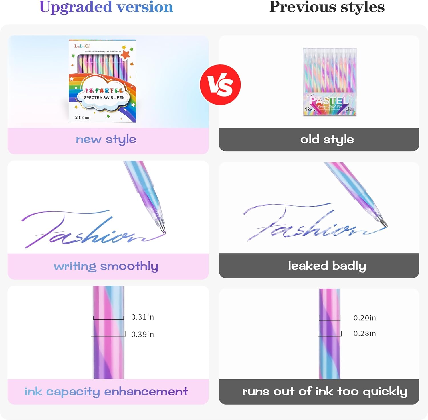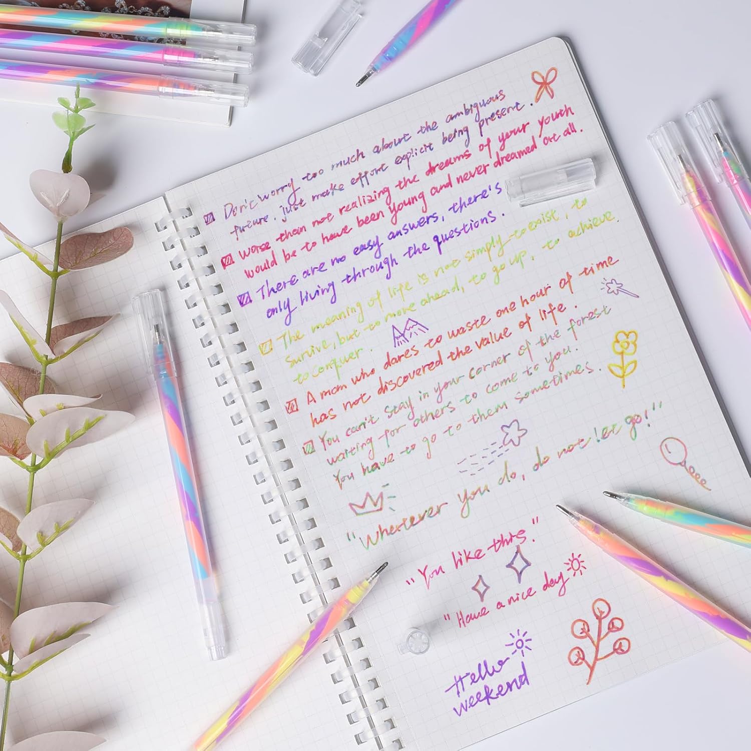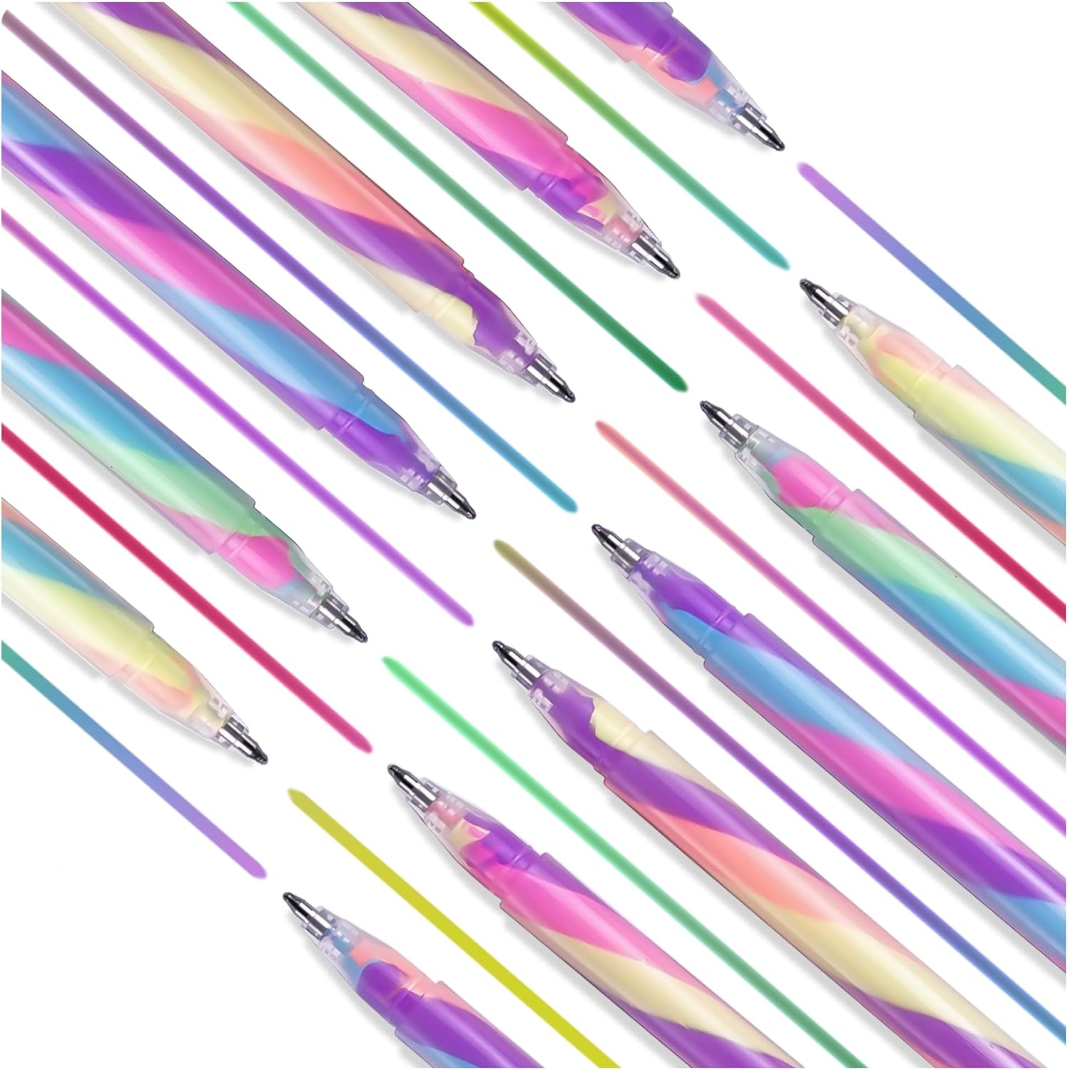- 【Magical 3-Color Mixing with Stable Chroma】12 pcs rainbow gel pens, including 12pcs patel with 6 color combination. Each pen contains triple-color ink blends for dynamic transitions with every stroke. New! Enhanced color stability prevents uneven fading or streaking, ensuring vivid rainbow effects on both light & dark papers.