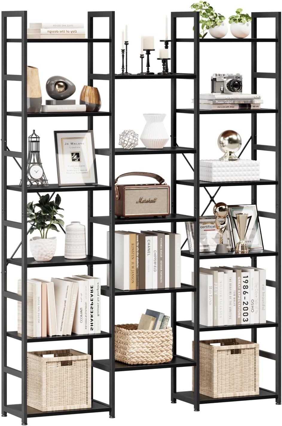 - ăTRIPLE COLUMN MULTIFUNCTIONAL BOOKSHELFă: Featuring 17 open shelves, this bookshelf provides ample space to store books, photo albums, alarm clocks, potted plants, and various decorations. It serves as both a functional storage unit and a stylish display for your beloved collections. The minimalist and elegant design complements a variety of home decor styles, making it a versatile addition to any study room, bedroom, living room, dining room, or office. Dimensions: 49.4" L x 10.2" W x 74.4" H.