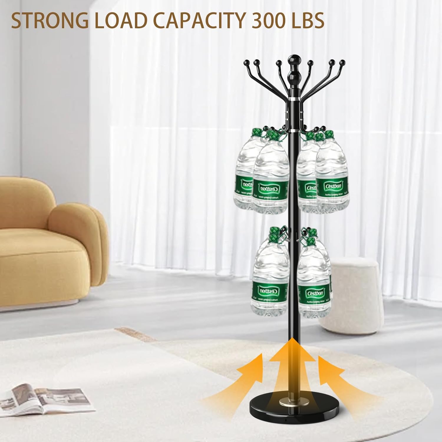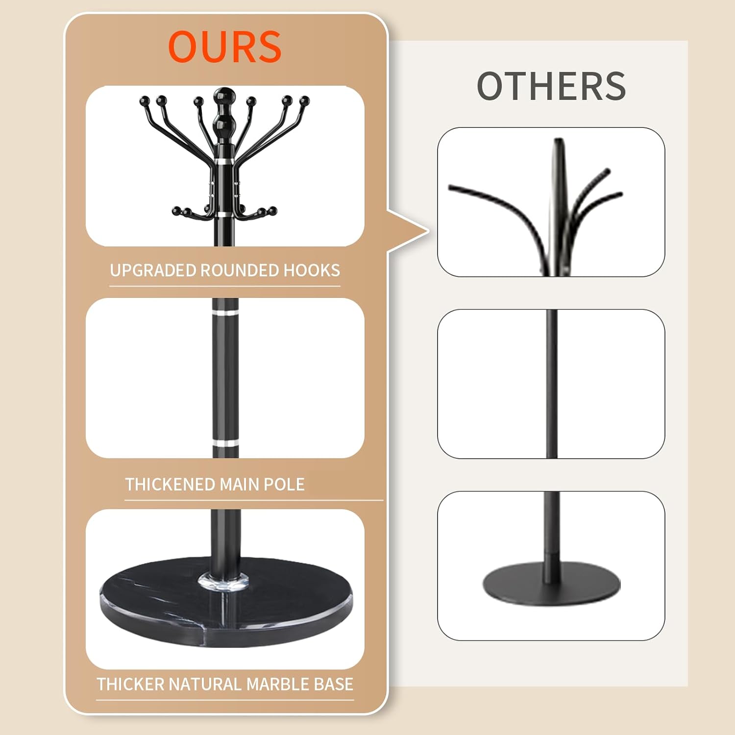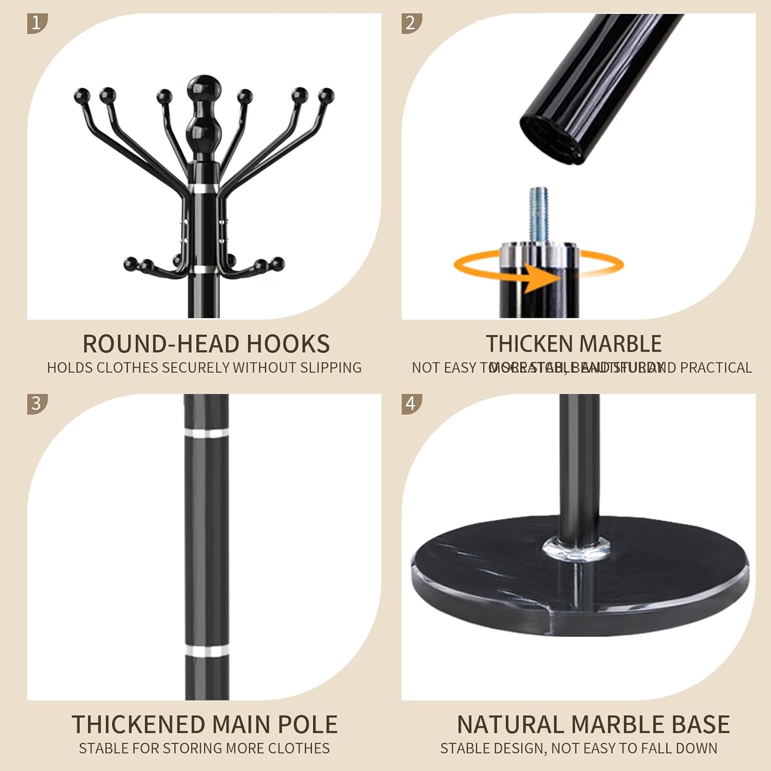 - 100% 15 INCH NATURAL MARBLE BASE:This coat rack freestanding is made of 100% natural marble,which diameter is 15 inch. Carefully selected natural marble, each piece has a unique vein carved by nature (not a quality issue). This base is capable of supporting 300 LBS, hanging heavy winter coats and briefcases very firmly without wobbling