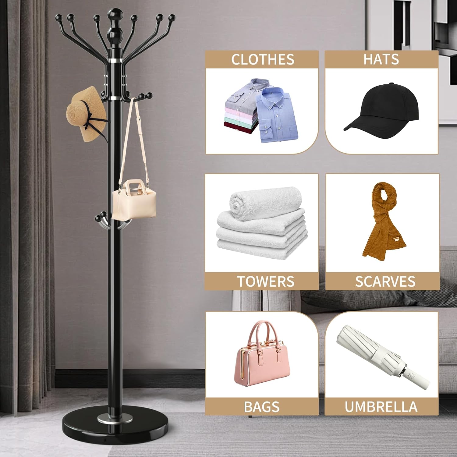 - 16 HOOKS MEET DAILY NEEDS:This modern coat rack has 16 hooks. Make full use of the space to meet the hangings need of winter jackets, briefcases, hats and more. Each hook has exquisite rounded small ball refinement to take care of your clothes. Not only a practical tool for hanging clothes, briefcases and coats, but also a beautiful decoration for your room and office. The coat rack can be placed in the entrance, living room, bedroom, office and the corner you need