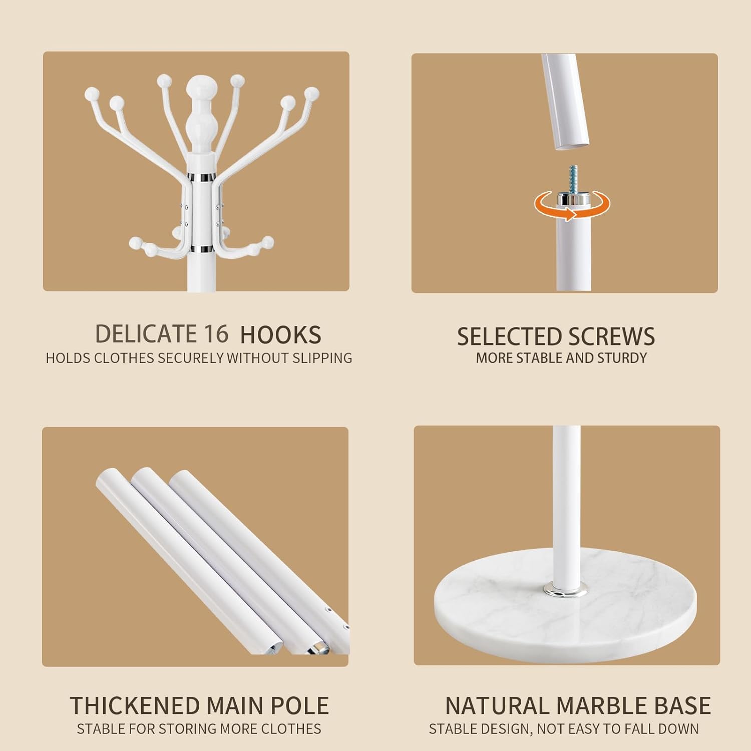 Modern Coat Rack with Natural Marble Base, Metal Freestanding Coat Racks with 16 Hooks, Heavy Duty Coat Rack Stand, Standing Coat Hall Tree Hanger Holder Stand for Entryway,Office